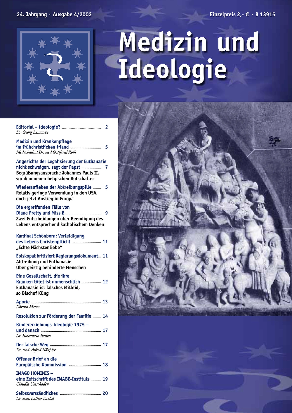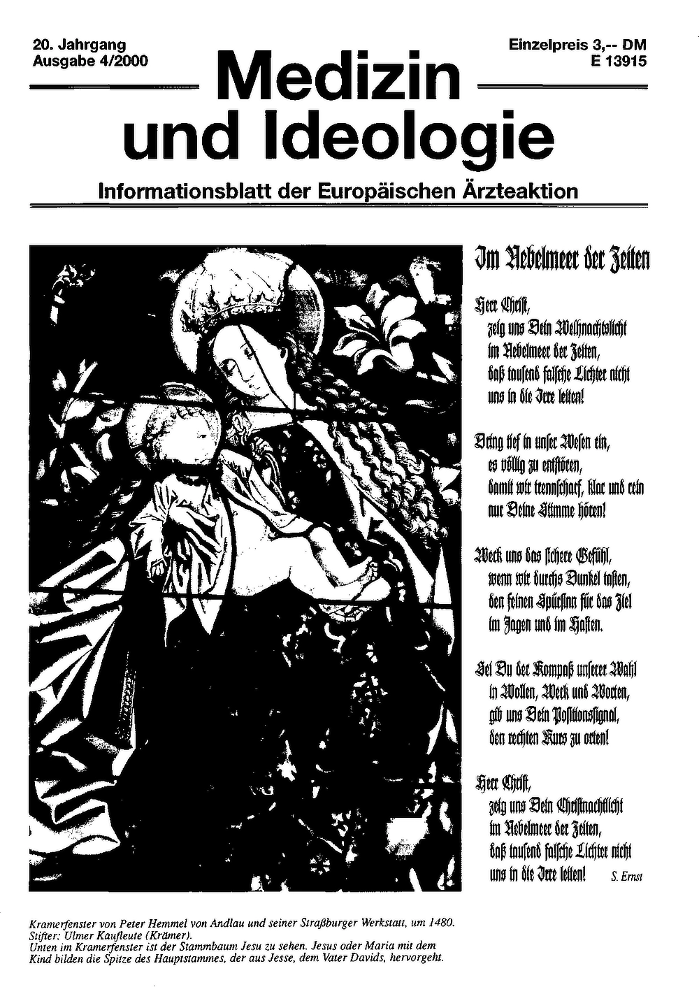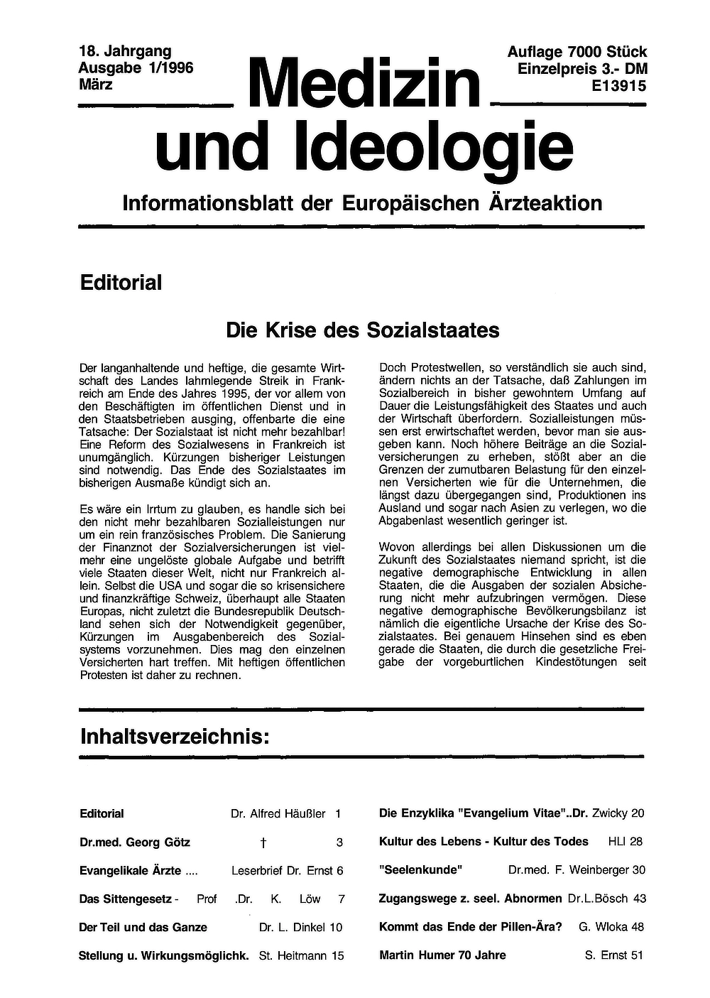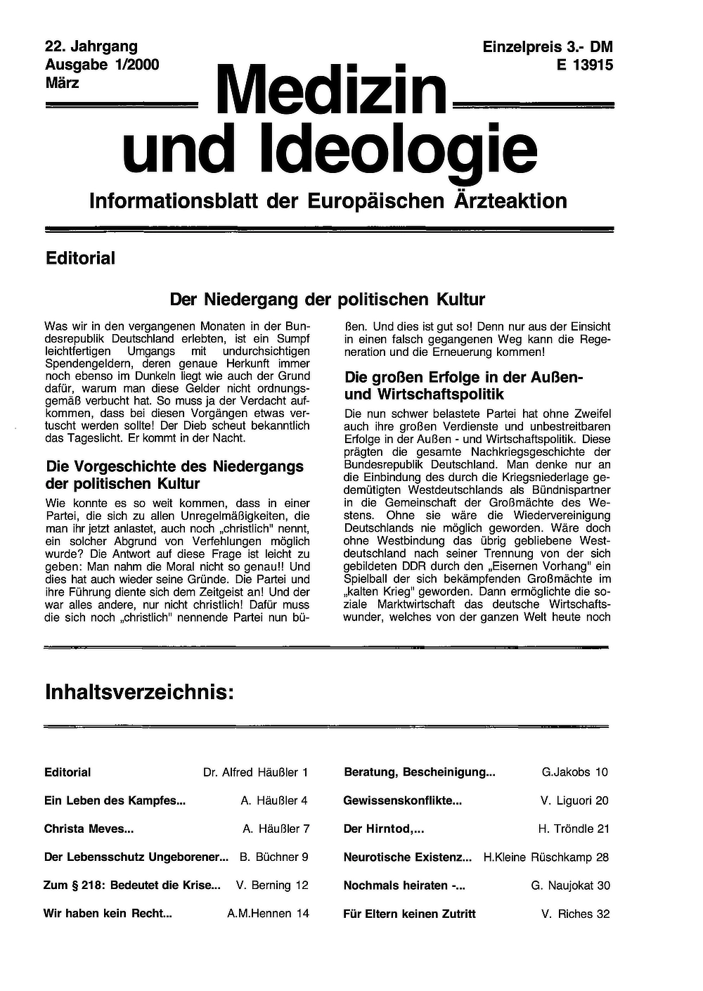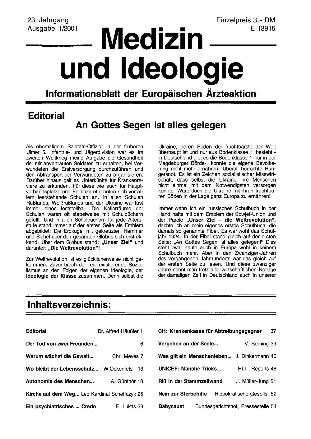 Dabei gibt der Name Medizin und Ideologie immer mal wieder Anlaß zur Nachfrage, denn häufig versteht man unter „Ideologie" eine eher willkürliche, sachlich nur teilweise begründete und verzerrte Wahrnehmung und Interpretation der Realität. Doch der Begriff „Ideologie" bedeutet wörtlich die „Lehre von den Ideen" und die Ausformung einer konkreten weltanschaulichen Perspektive im Sinne eines schlüssigen Ideensystems. Und so dient diese Zeitschrift dem Anliegen, die medizinisch-ethischen Grenzfragen im Kontext der sie beeinflussenden weltanschaulichen Ideen darzustellen und zu verstehen.