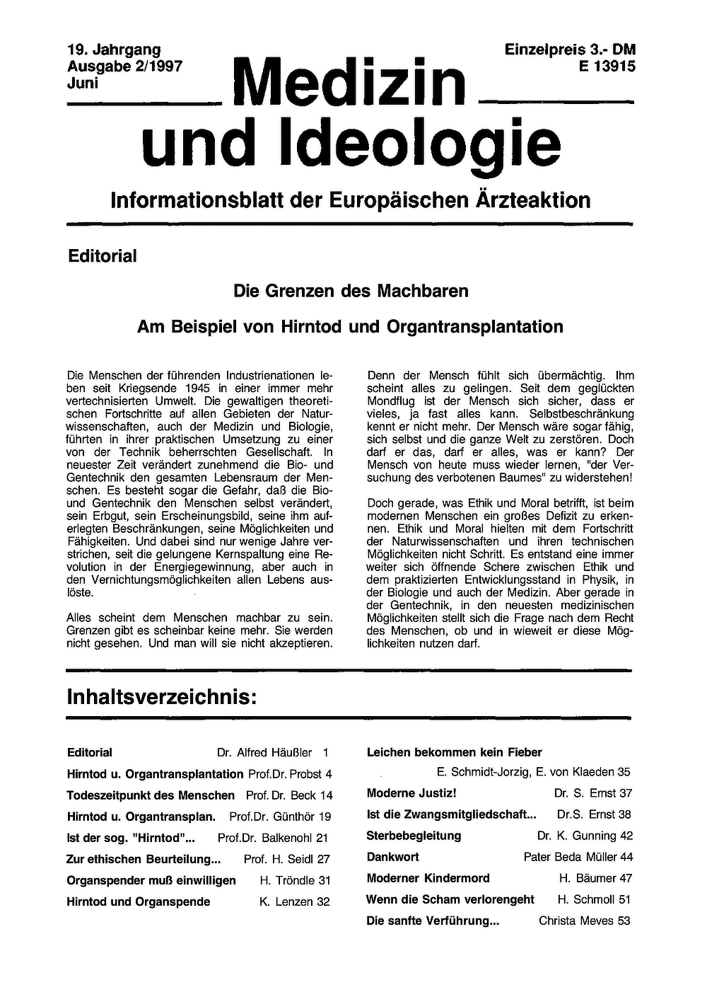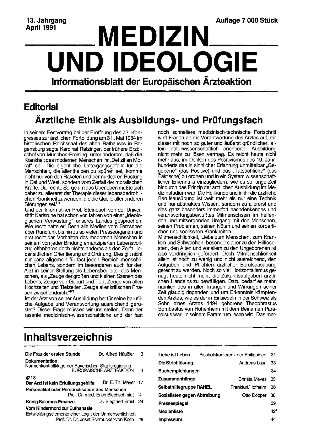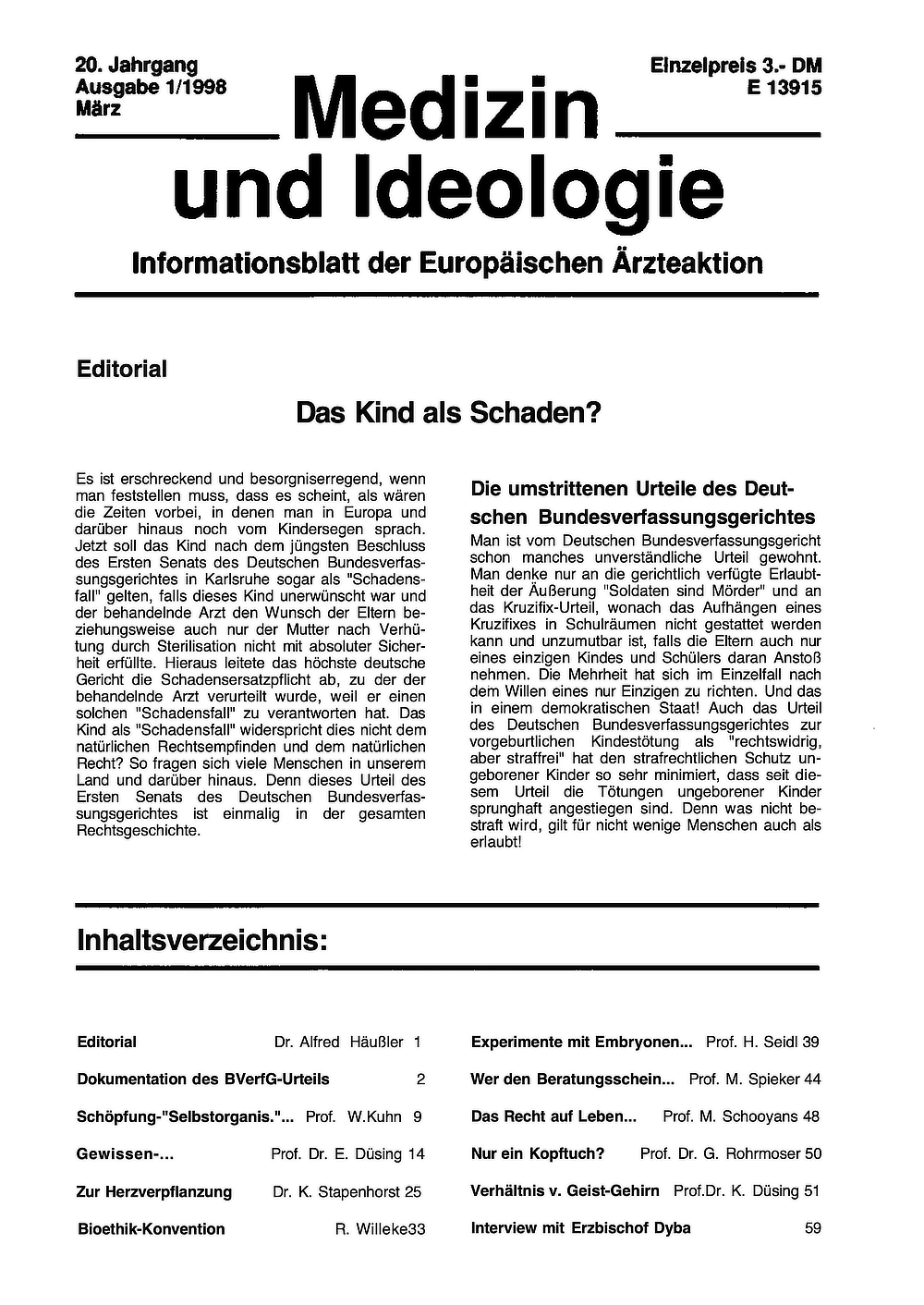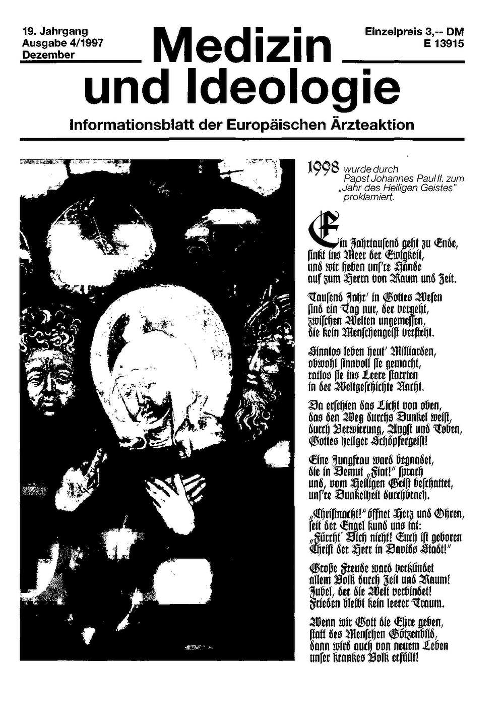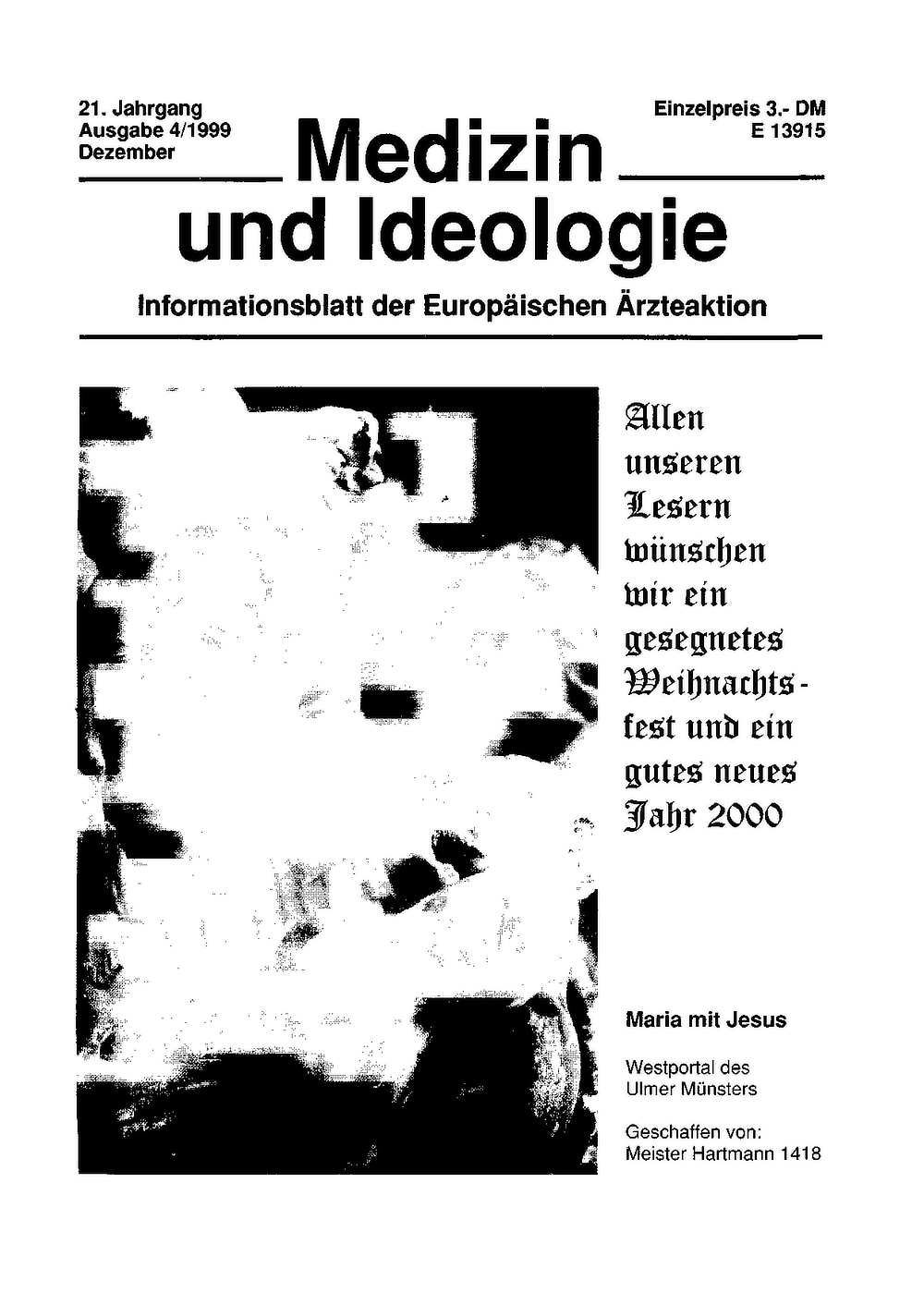 Dabei gibt der Name Medizin und Ideologie immer mal wieder Anlaß zur Nachfrage, denn häufig versteht man unter „Ideologie" eine eher willkürliche, sachlich nur teilweise begründete und verzerrte Wahrnehmung und Interpretation der Realität. Doch der Begriff „Ideologie" bedeutet wörtlich die „Lehre von den Ideen" und die Ausformung einer konkreten weltanschaulichen Perspektive im Sinne eines schlüssigen Ideensystems. Und so dient diese Zeitschrift dem Anliegen, die medizinisch-ethischen Grenzfragen im Kontext der sie beeinflussenden weltanschaulichen Ideen darzustellen und zu verstehen.