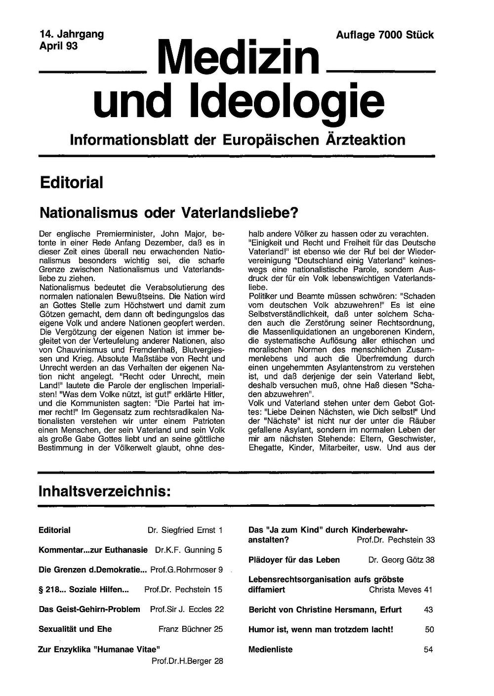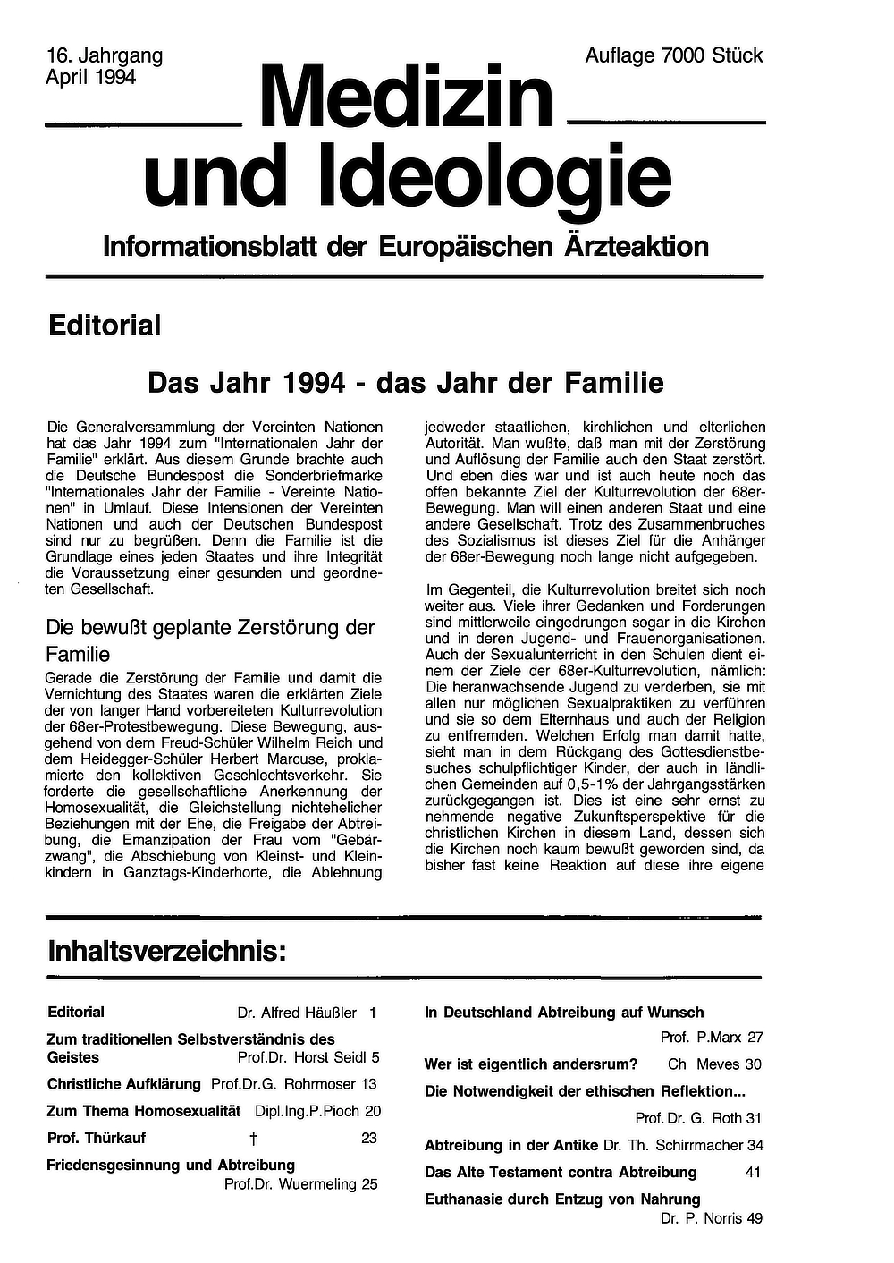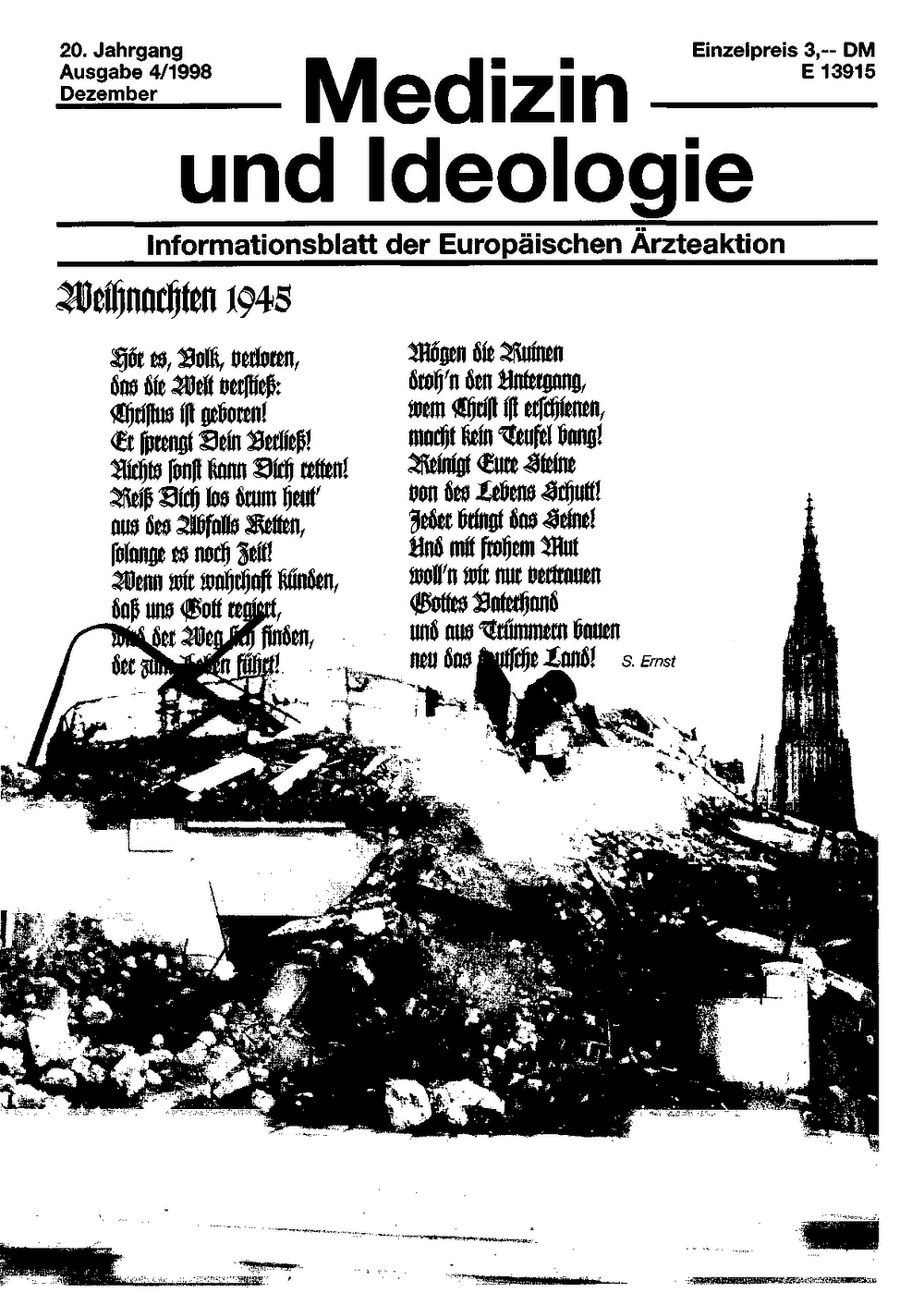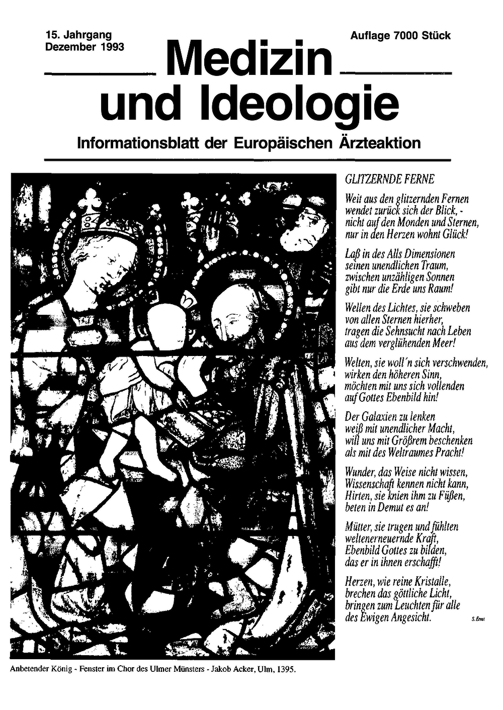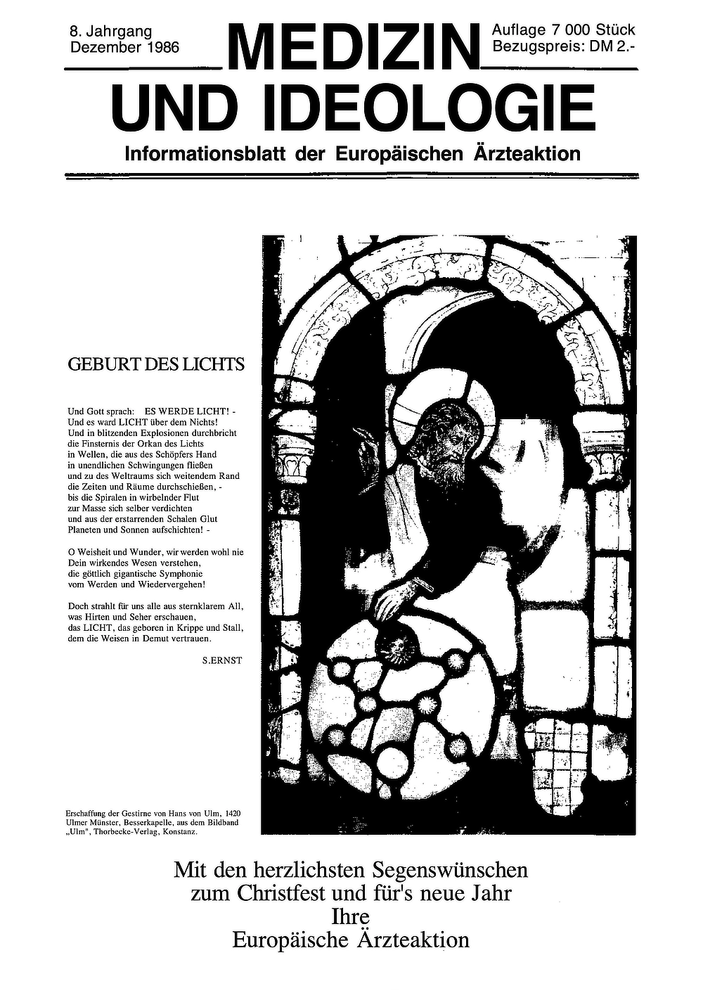 Dabei gibt der Name Medizin und Ideologie immer mal wieder Anlaß zur Nachfrage, denn häufig versteht man unter „Ideologie" eine eher willkürliche, sachlich nur teilweise begründete und verzerrte Wahrnehmung und Interpretation der Realität. Doch der Begriff „Ideologie" bedeutet wörtlich die „Lehre von den Ideen" und die Ausformung einer konkreten weltanschaulichen Perspektive im Sinne eines schlüssigen Ideensystems. Und so dient diese Zeitschrift dem Anliegen, die medizinisch-ethischen Grenzfragen im Kontext der sie beeinflussenden weltanschaulichen Ideen darzustellen und zu verstehen.