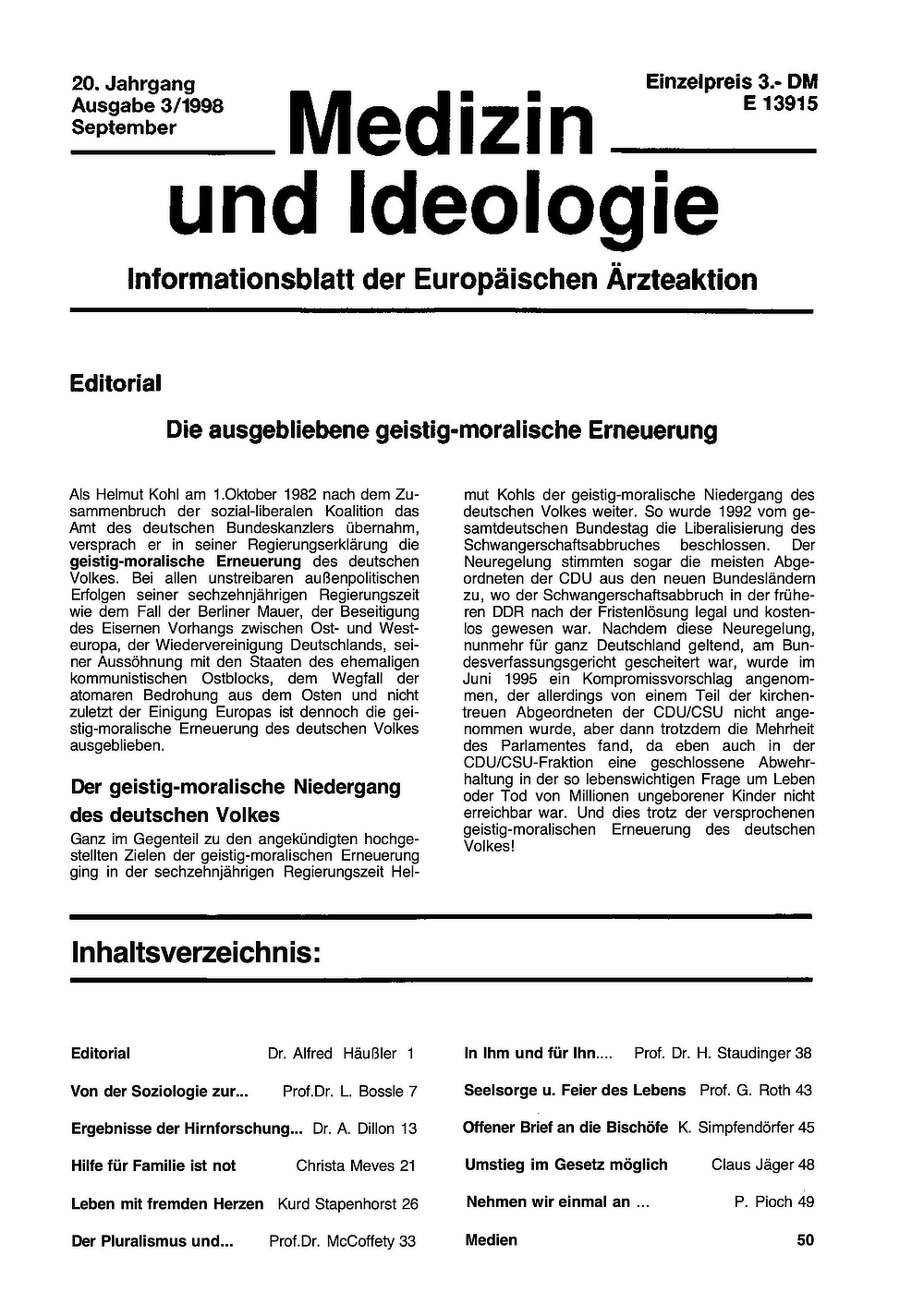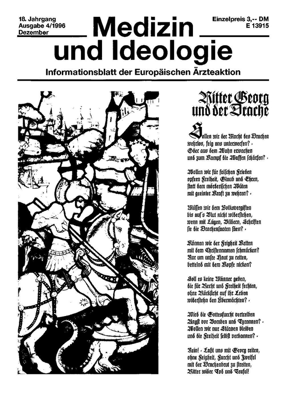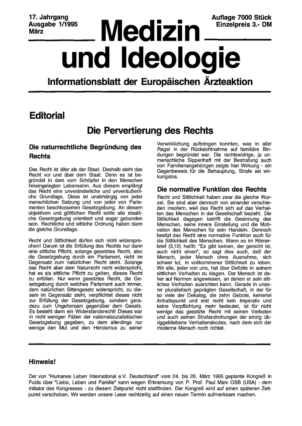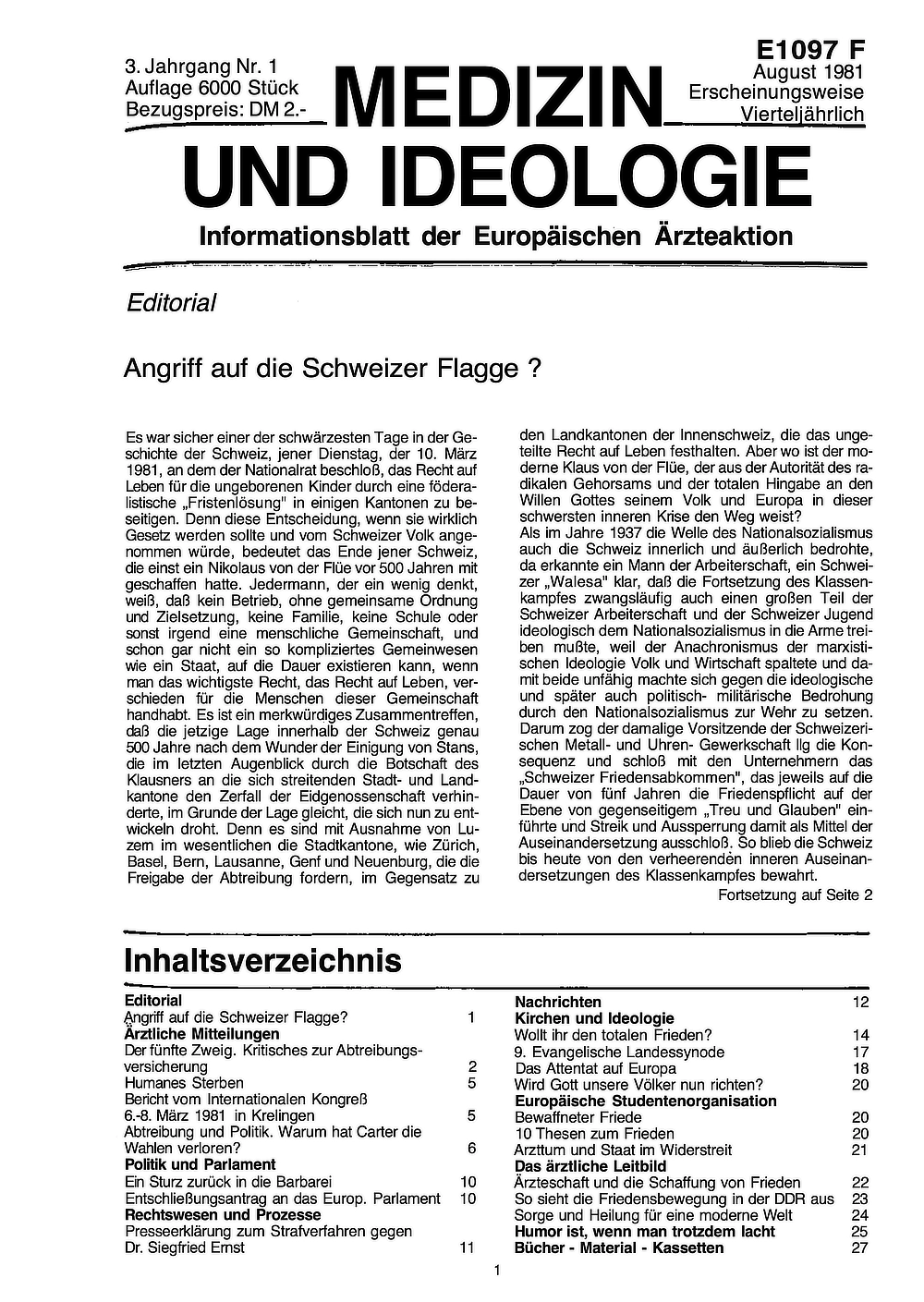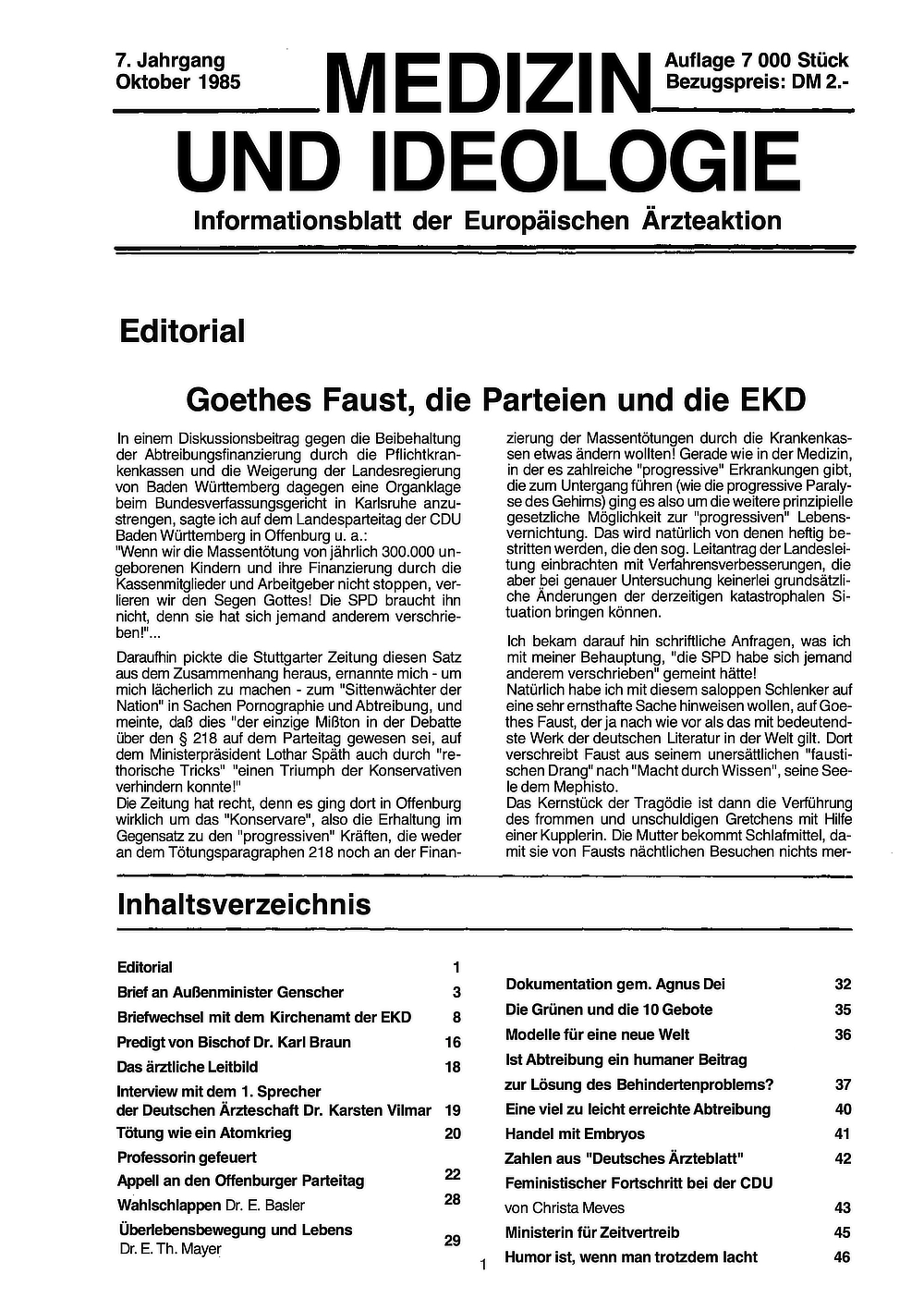 Dabei gibt der Name Medizin und Ideologie immer mal wieder Anlaß zur Nachfrage, denn häufig versteht man unter „Ideologie" eine eher willkürliche, sachlich nur teilweise begründete und verzerrte Wahrnehmung und Interpretation der Realität. Doch der Begriff „Ideologie" bedeutet wörtlich die „Lehre von den Ideen" und die Ausformung einer konkreten weltanschaulichen Perspektive im Sinne eines schlüssigen Ideensystems. Und so dient diese Zeitschrift dem Anliegen, die medizinisch-ethischen Grenzfragen im Kontext der sie beeinflussenden weltanschaulichen Ideen darzustellen und zu verstehen.