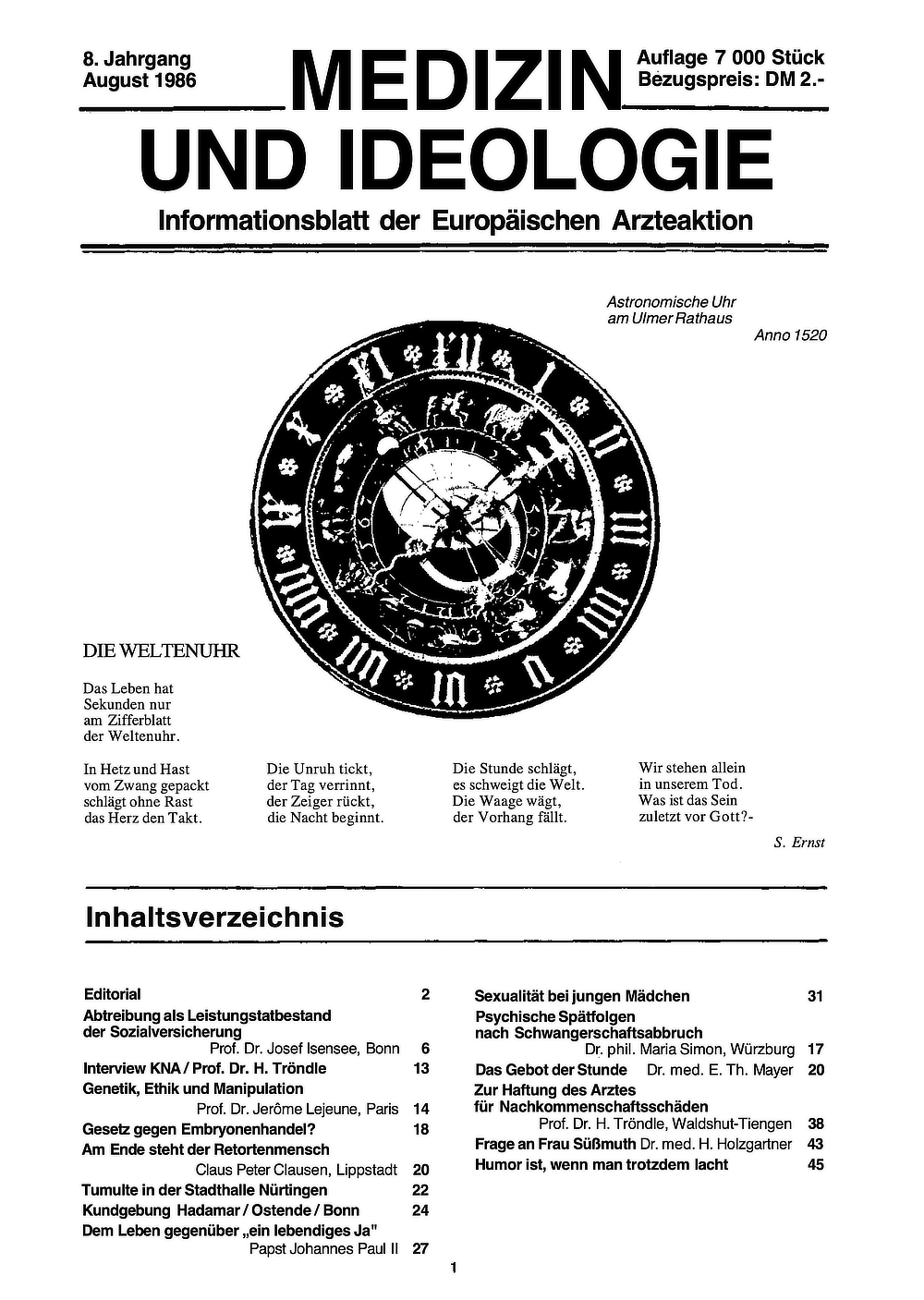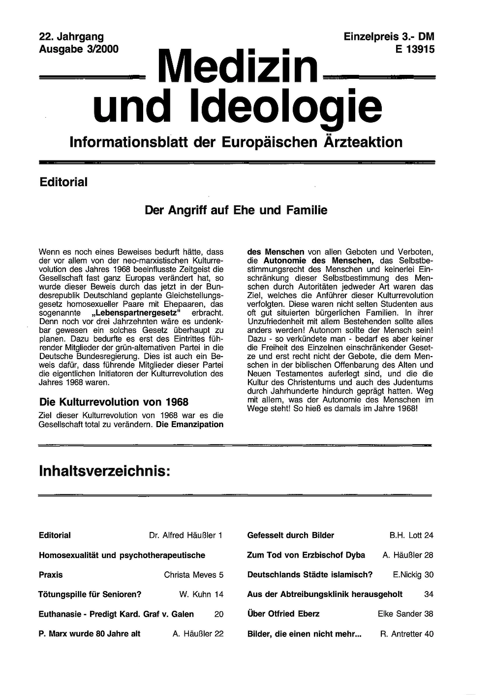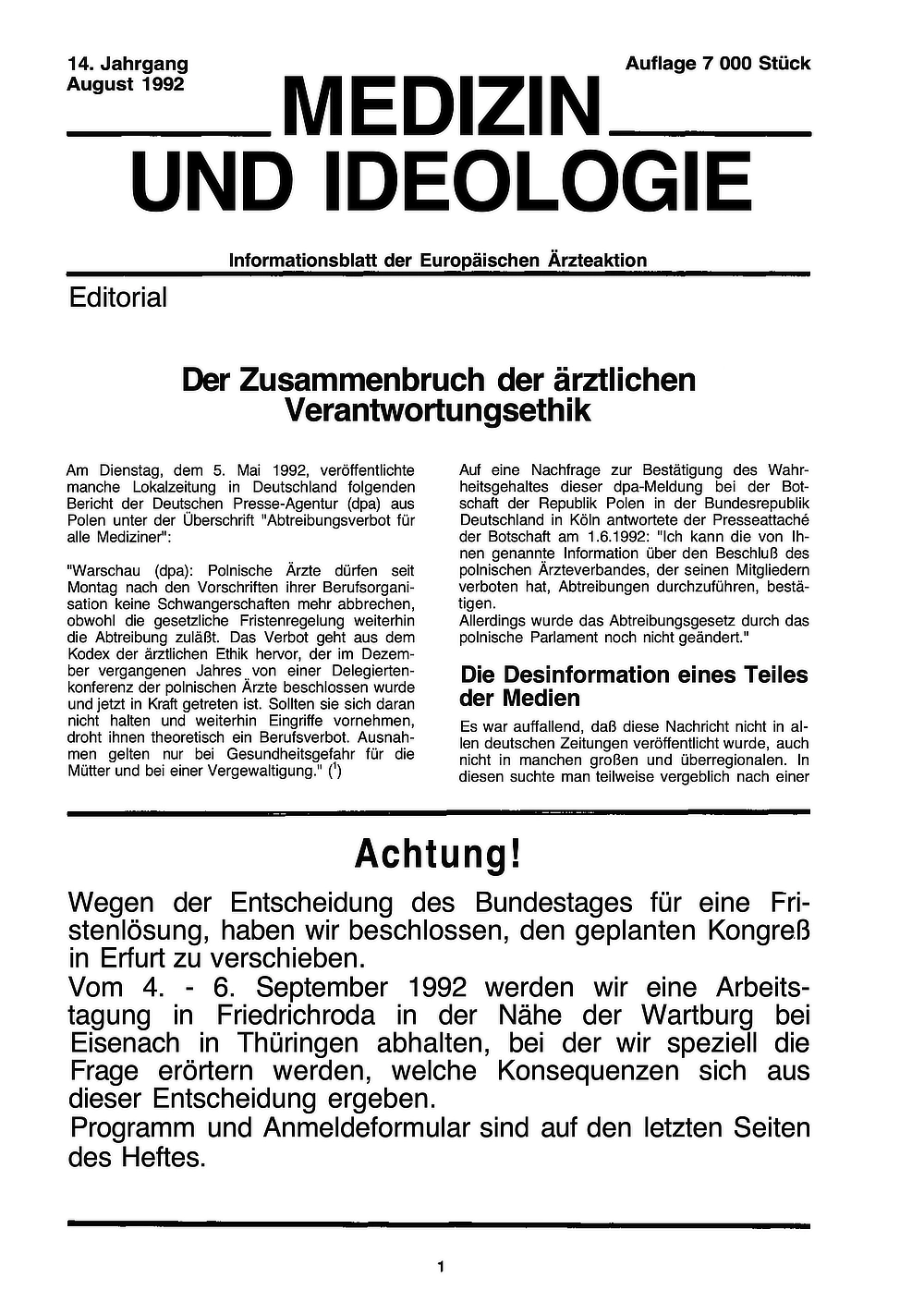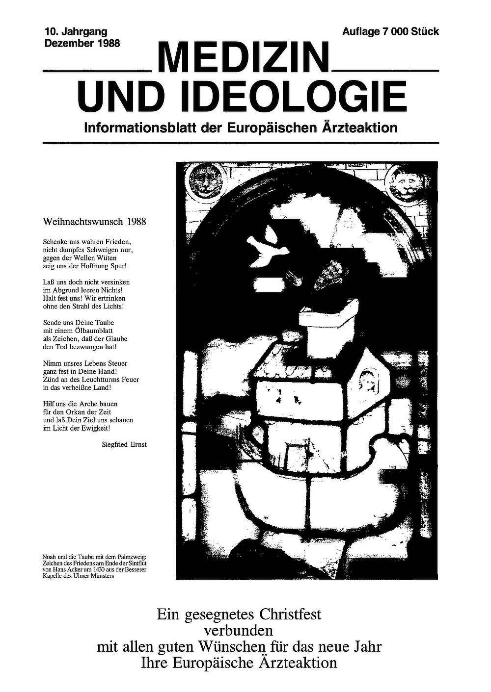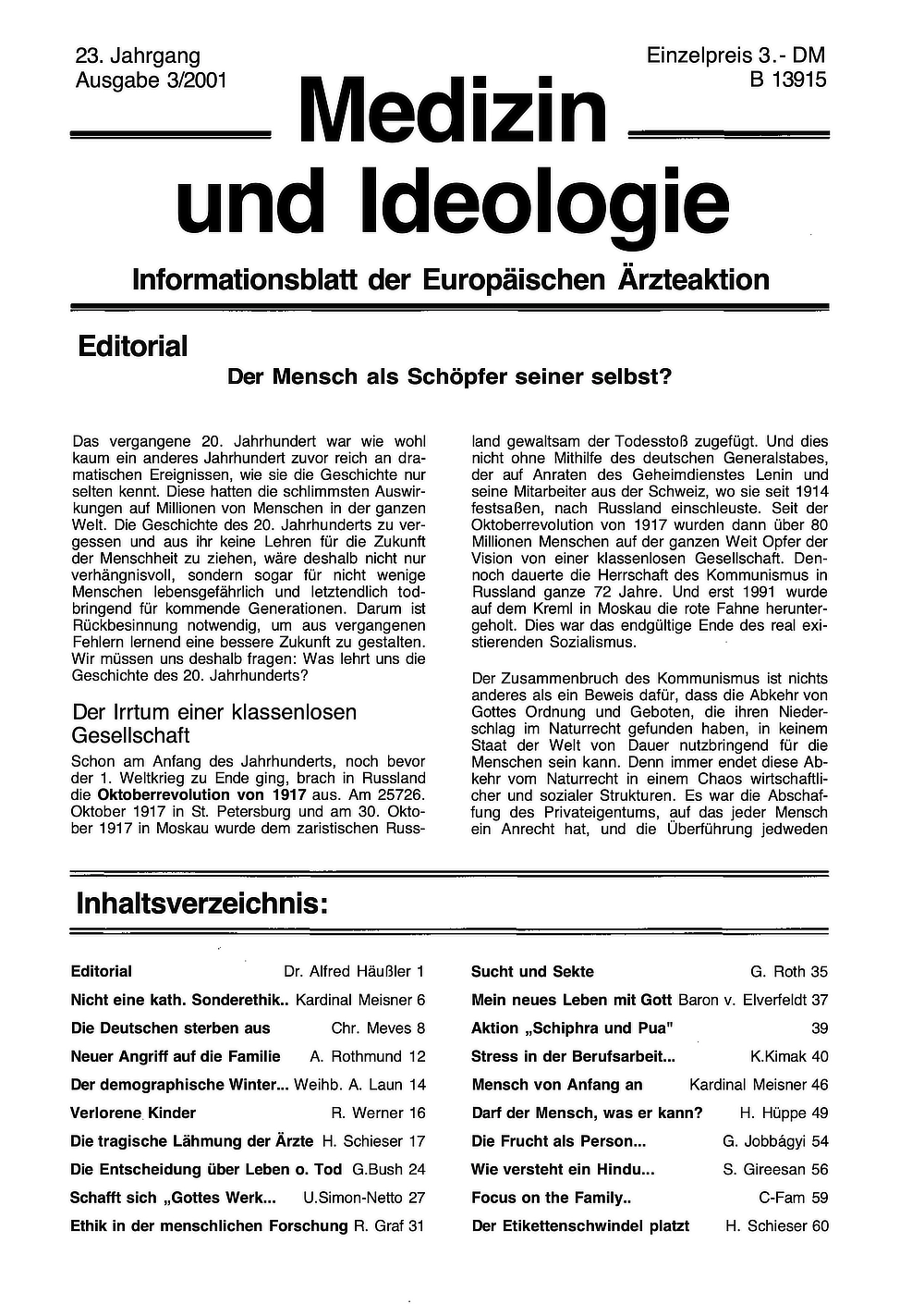Dabei gibt der Name Medizin und Ideologie immer mal wieder Anlaß zur Nachfrage, denn häufig versteht man unter „Ideologie" eine eher willkürliche, sachlich nur teilweise begründete und verzerrte Wahrnehmung und Interpretation der Realität. Doch der Begriff „Ideologie" bedeutet wörtlich die „Lehre von den Ideen" und die Ausformung einer konkreten weltanschaulichen Perspektive im Sinne eines schlüssigen Ideensystems. Und so dient diese Zeitschrift dem Anliegen, die medizinisch-ethischen Grenzfragen im Kontext der sie beeinflussenden weltanschaulichen Ideen darzustellen und zu verstehen.