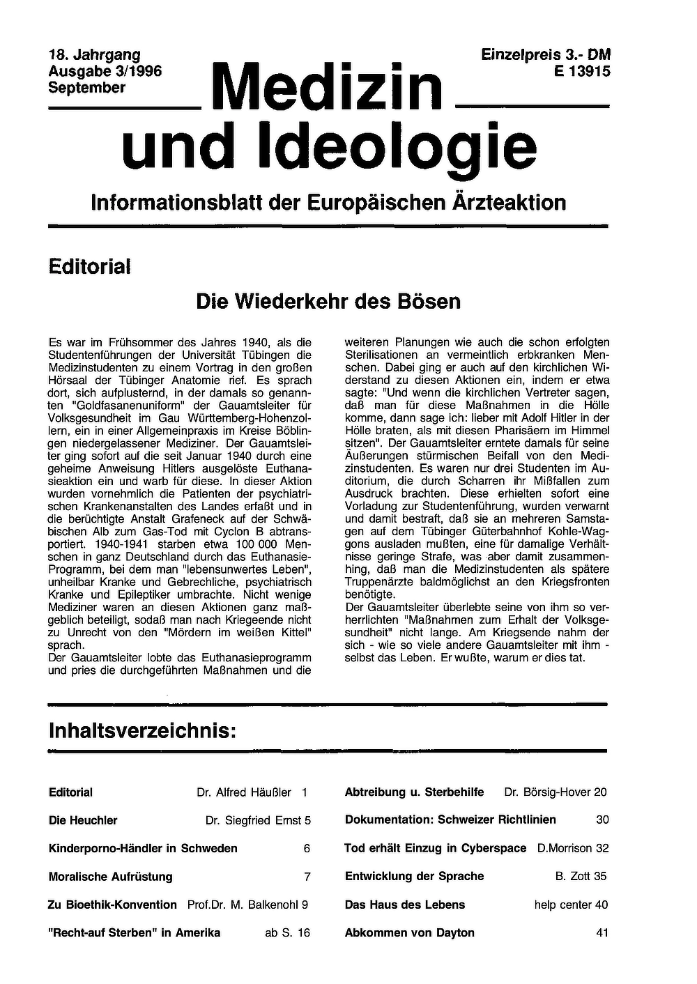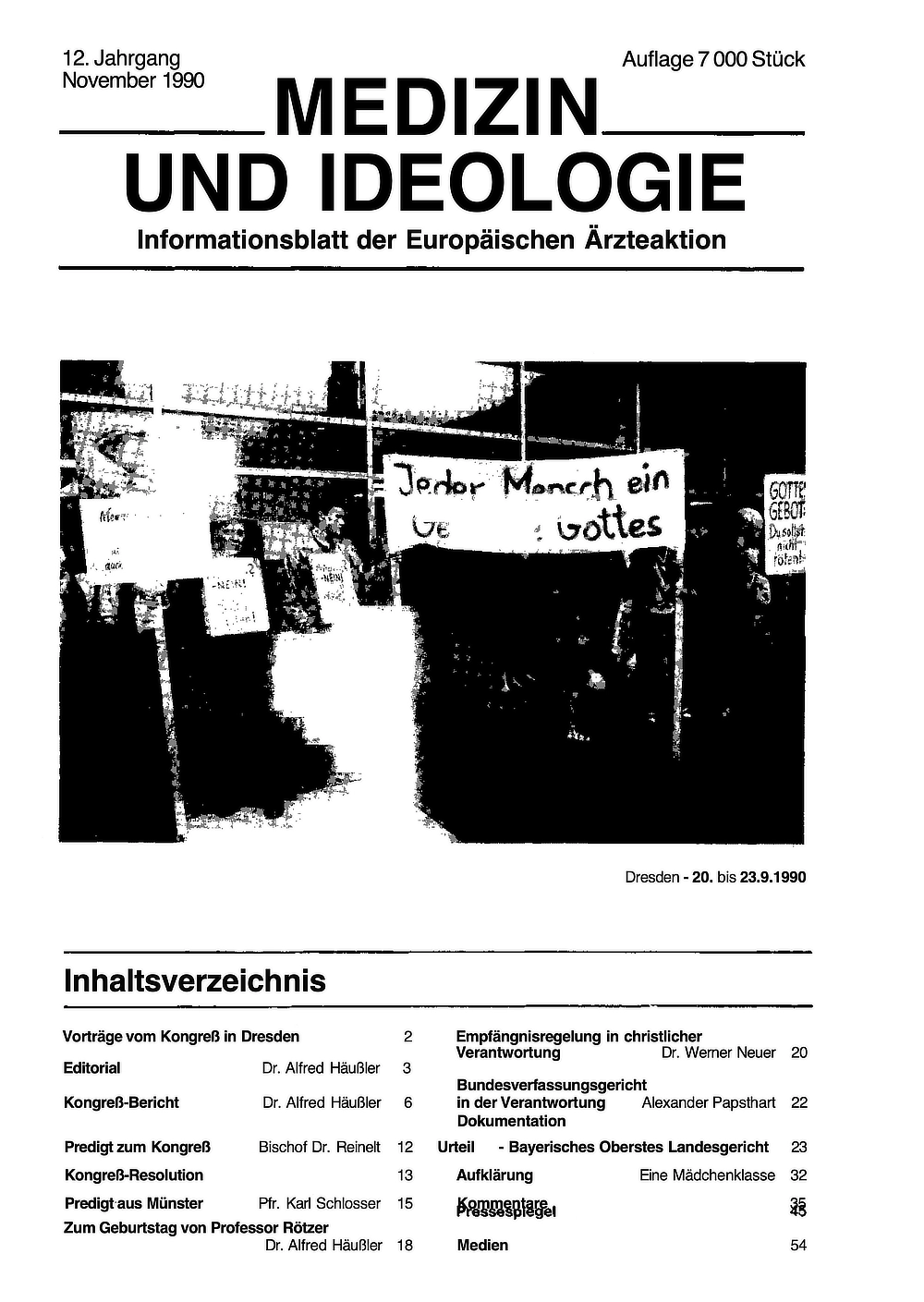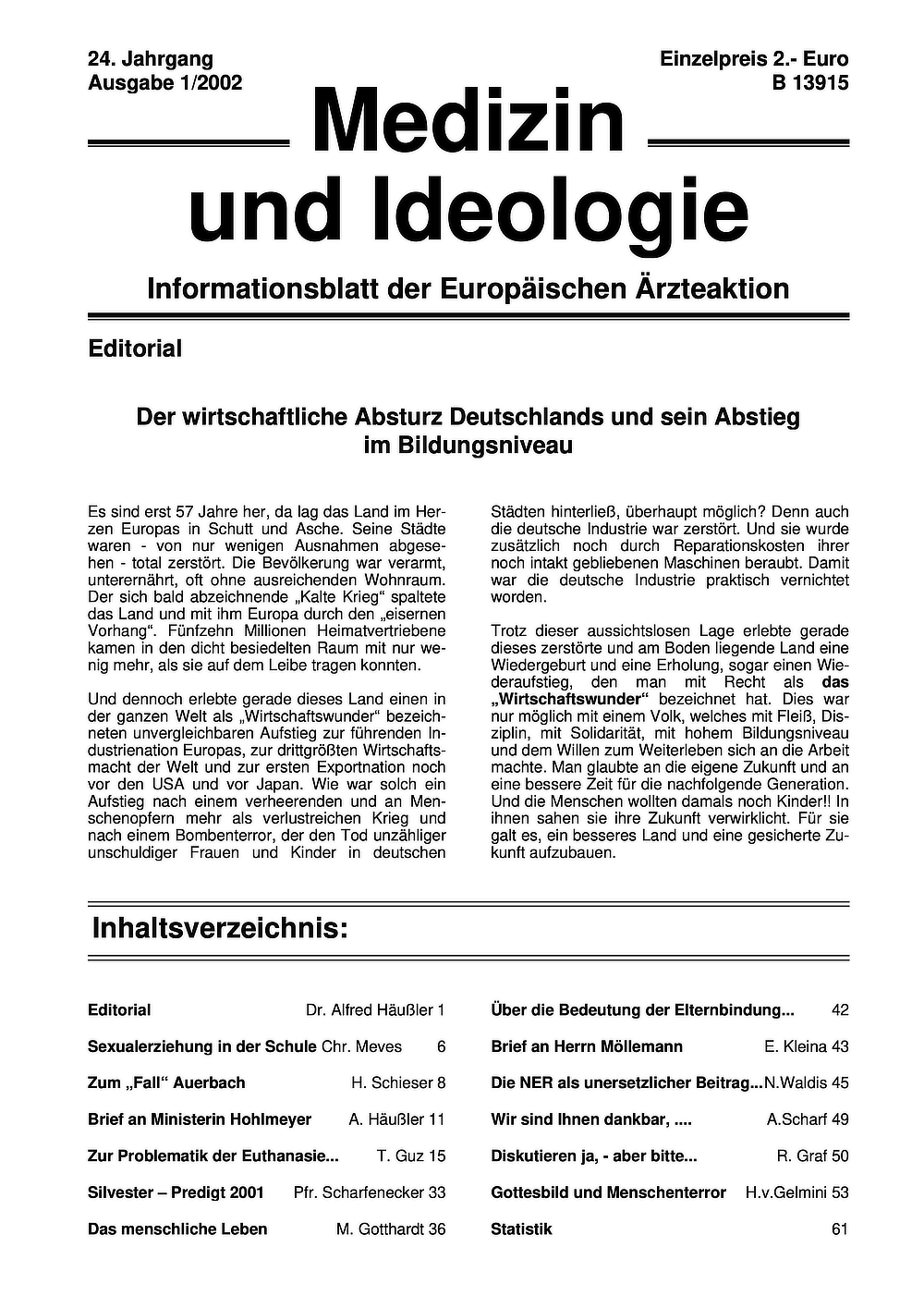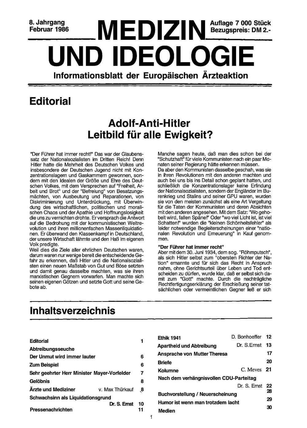 Dabei gibt der Name Medizin und Ideologie immer mal wieder Anlaß zur Nachfrage, denn häufig versteht man unter „Ideologie" eine eher willkürliche, sachlich nur teilweise begründete und verzerrte Wahrnehmung und Interpretation der Realität. Doch der Begriff „Ideologie" bedeutet wörtlich die „Lehre von den Ideen" und die Ausformung einer konkreten weltanschaulichen Perspektive im Sinne eines schlüssigen Ideensystems. Und so dient diese Zeitschrift dem Anliegen, die medizinisch-ethischen Grenzfragen im Kontext der sie beeinflussenden weltanschaulichen Ideen darzustellen und zu verstehen.
