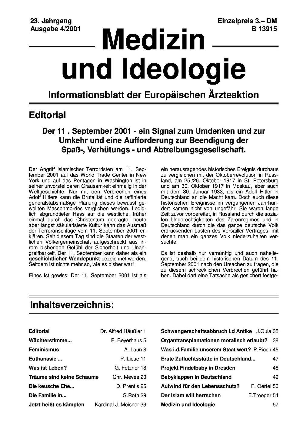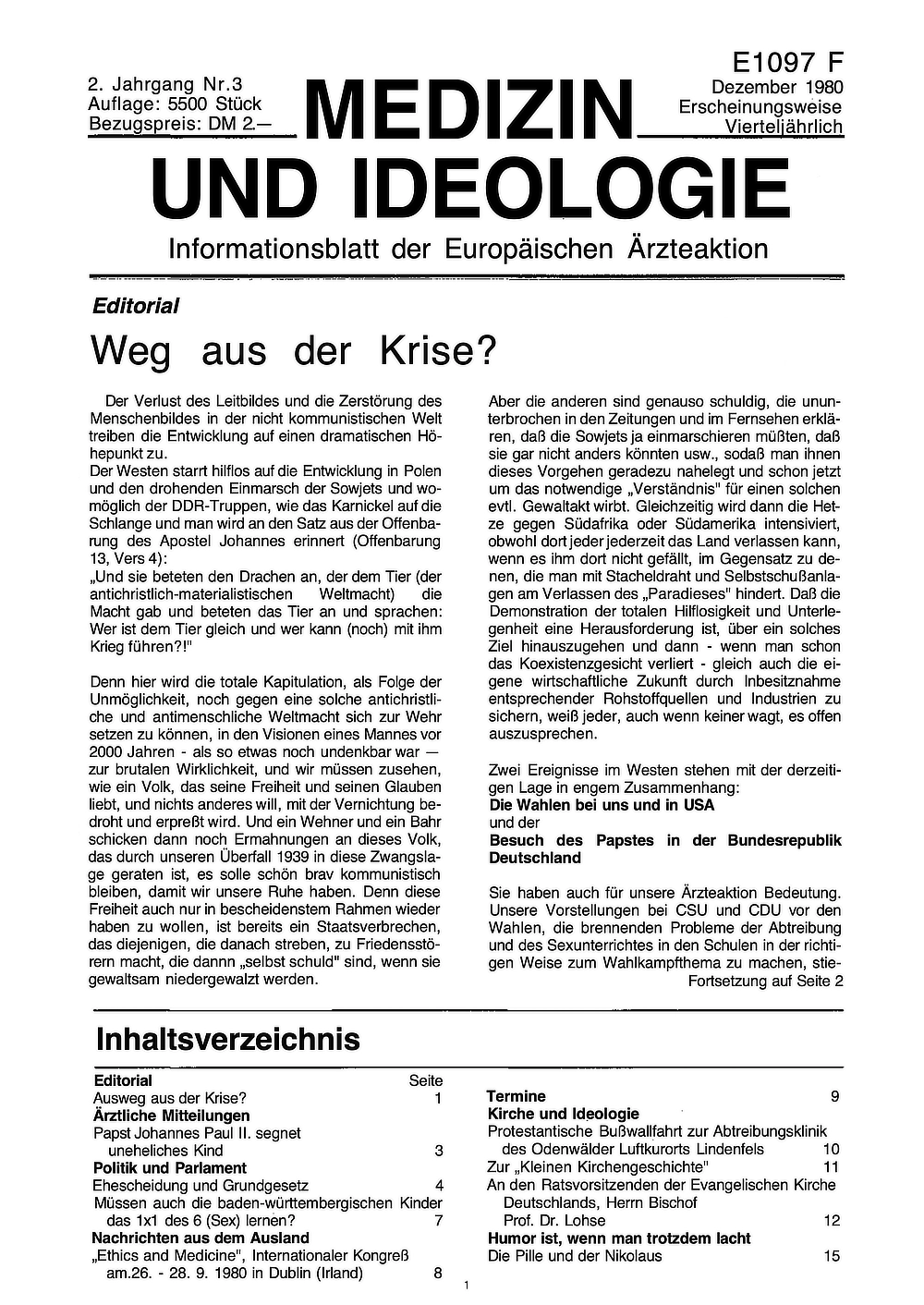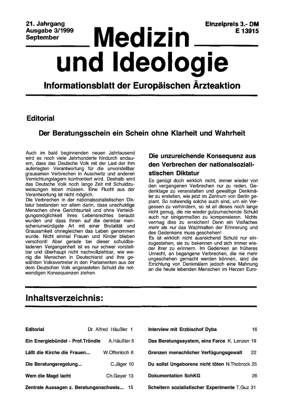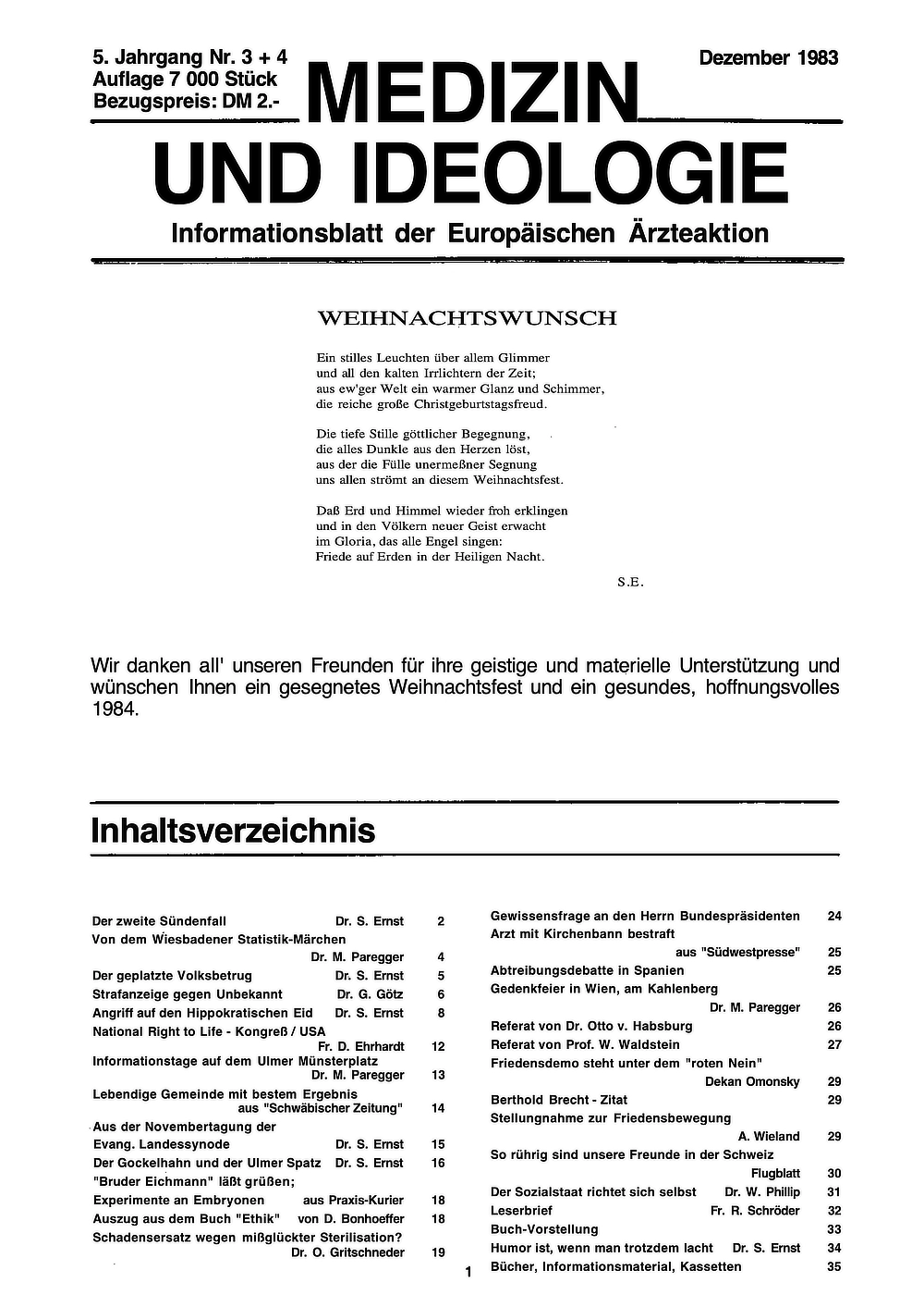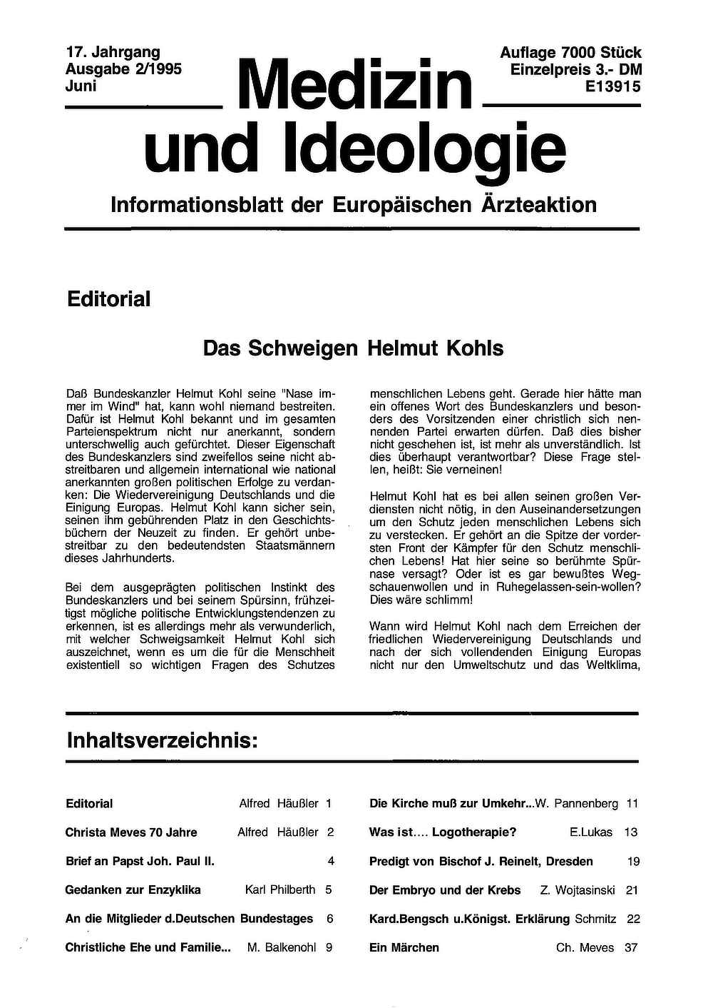 Dabei gibt der Name Medizin und Ideologie immer mal wieder Anlaß zur Nachfrage, denn häufig versteht man unter „Ideologie" eine eher willkürliche, sachlich nur teilweise begründete und verzerrte Wahrnehmung und Interpretation der Realität. Doch der Begriff „Ideologie" bedeutet wörtlich die „Lehre von den Ideen" und die Ausformung einer konkreten weltanschaulichen Perspektive im Sinne eines schlüssigen Ideensystems. Und so dient diese Zeitschrift dem Anliegen, die medizinisch-ethischen Grenzfragen im Kontext der sie beeinflussenden weltanschaulichen Ideen darzustellen und zu verstehen.