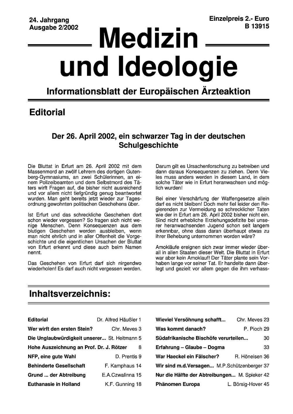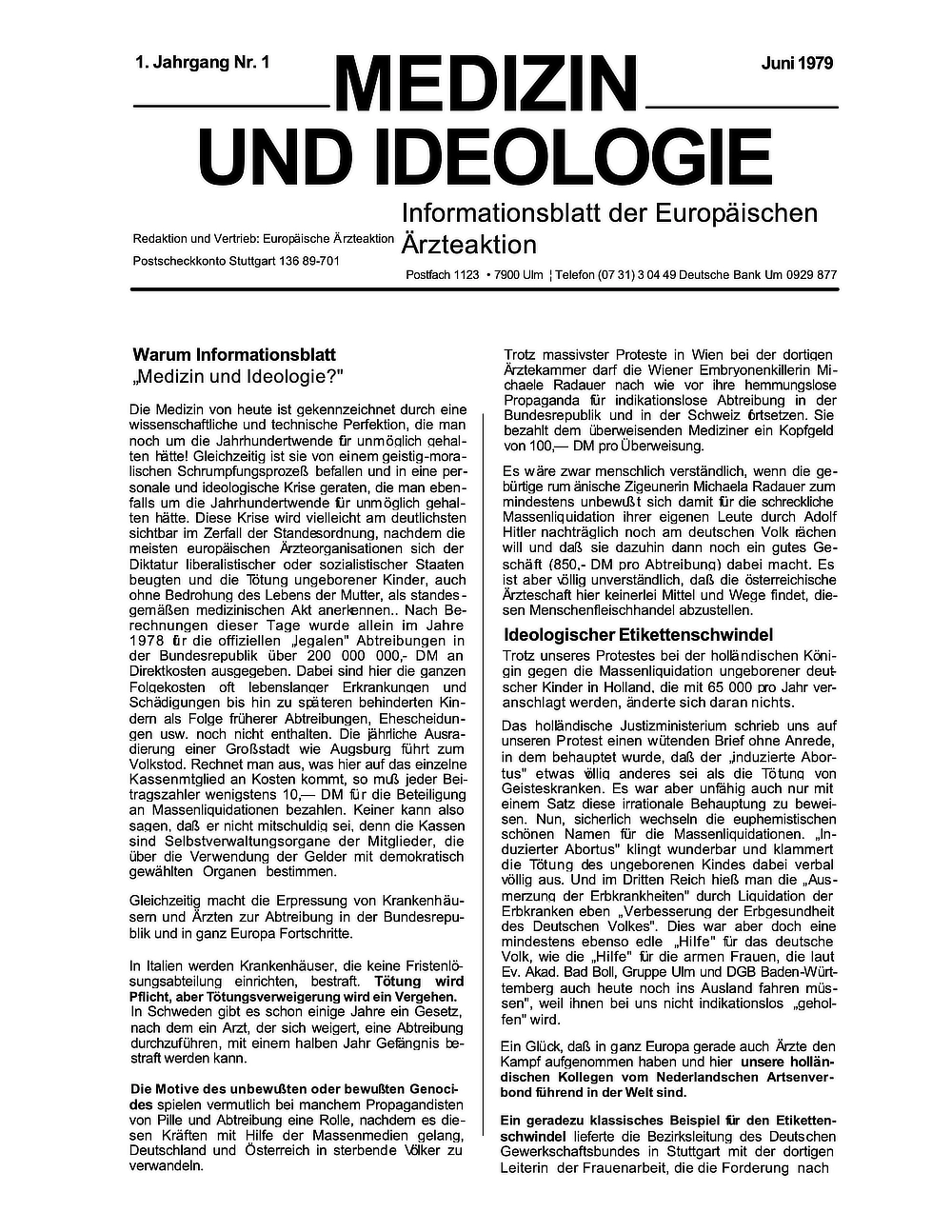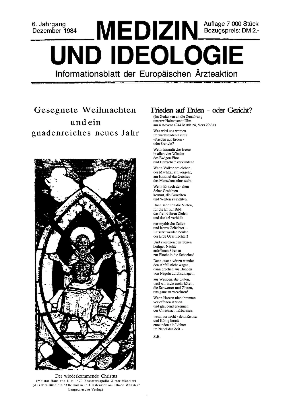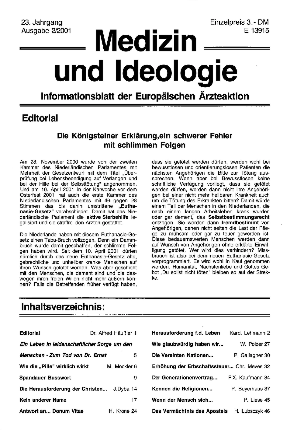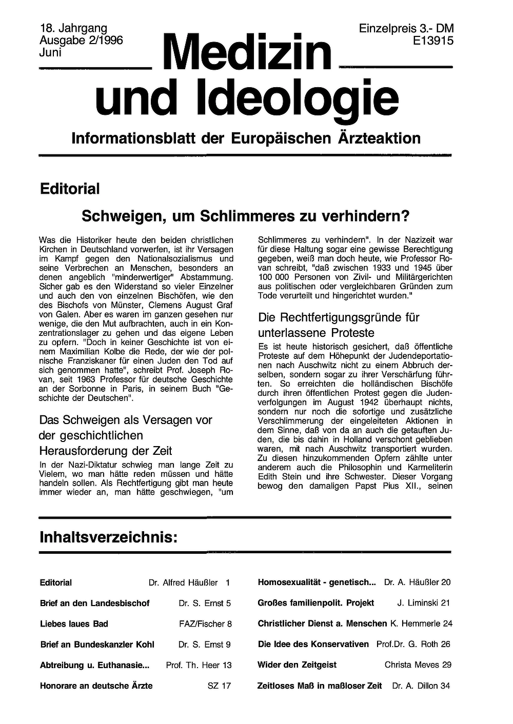Dabei gibt der Name Medizin und Ideologie immer mal wieder Anlaß zur Nachfrage, denn häufig versteht man unter „Ideologie" eine eher willkürliche, sachlich nur teilweise begründete und verzerrte Wahrnehmung und Interpretation der Realität. Doch der Begriff „Ideologie" bedeutet wörtlich die „Lehre von den Ideen" und die Ausformung einer konkreten weltanschaulichen Perspektive im Sinne eines schlüssigen Ideensystems. Und so dient diese Zeitschrift dem Anliegen, die medizinisch-ethischen Grenzfragen im Kontext der sie beeinflussenden weltanschaulichen Ideen darzustellen und zu verstehen.