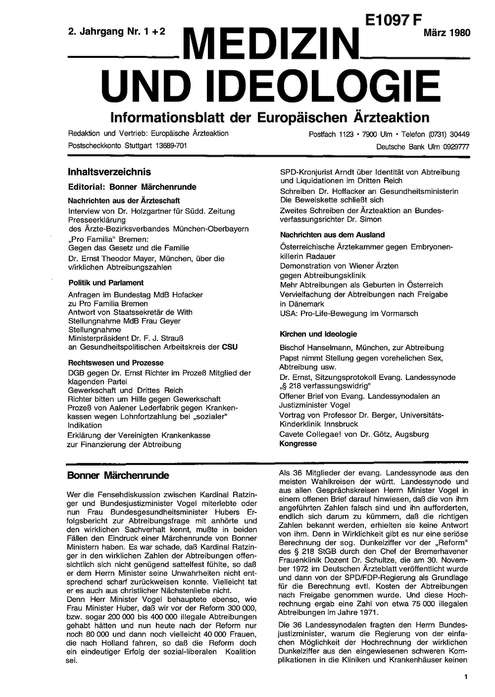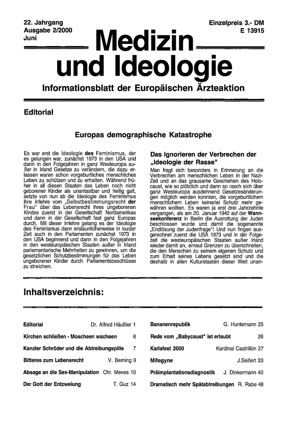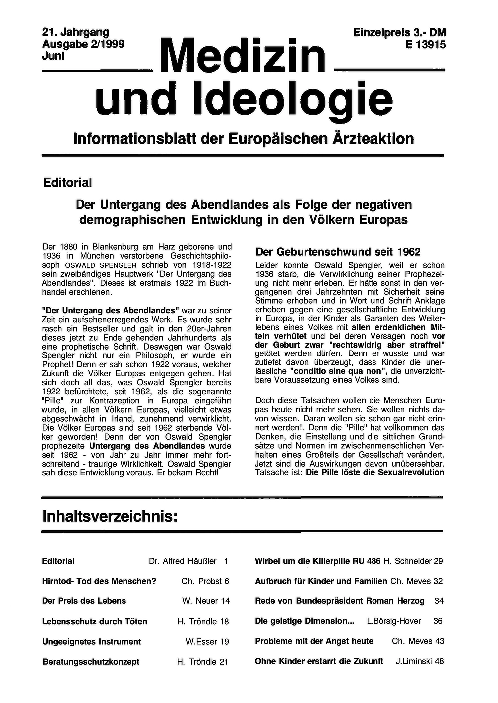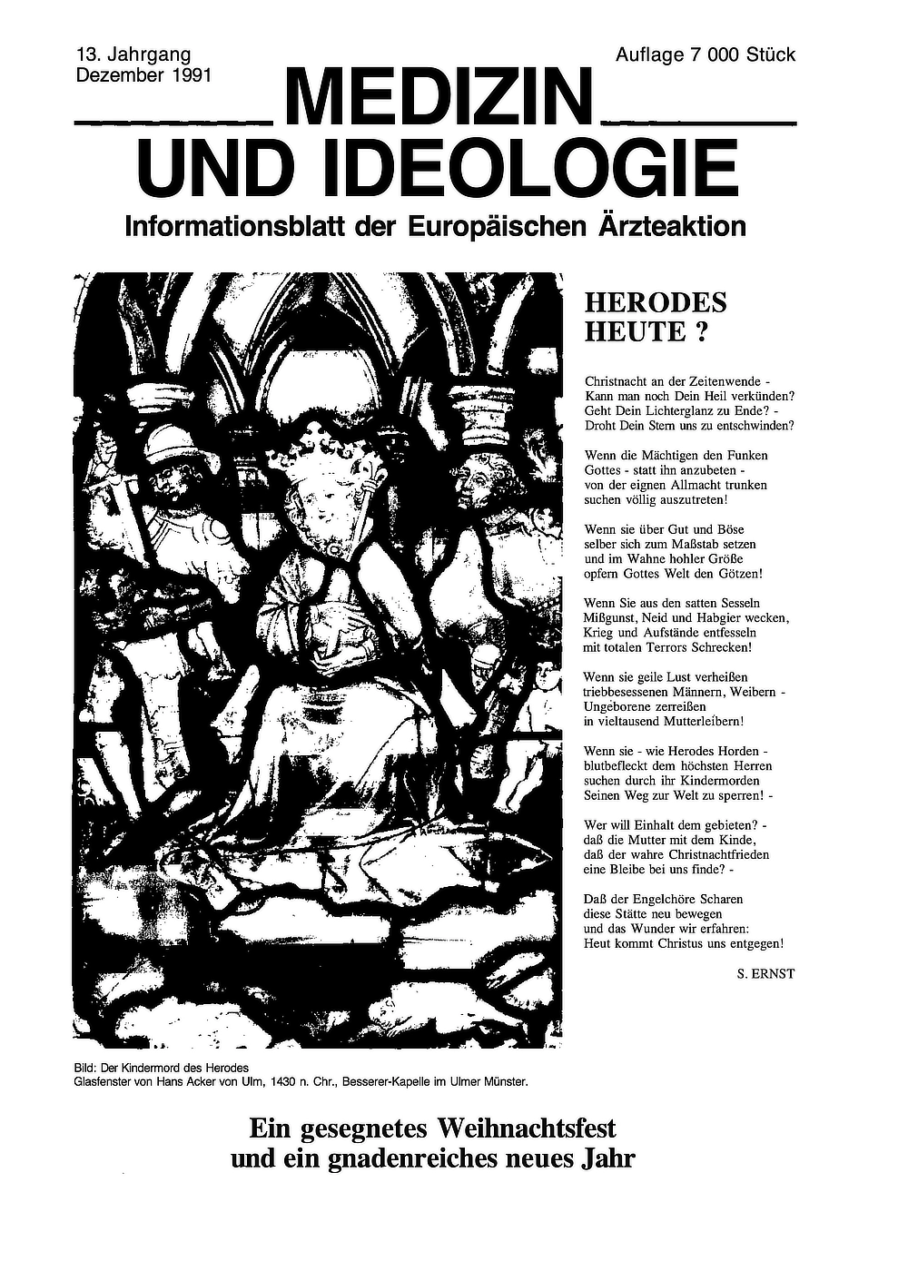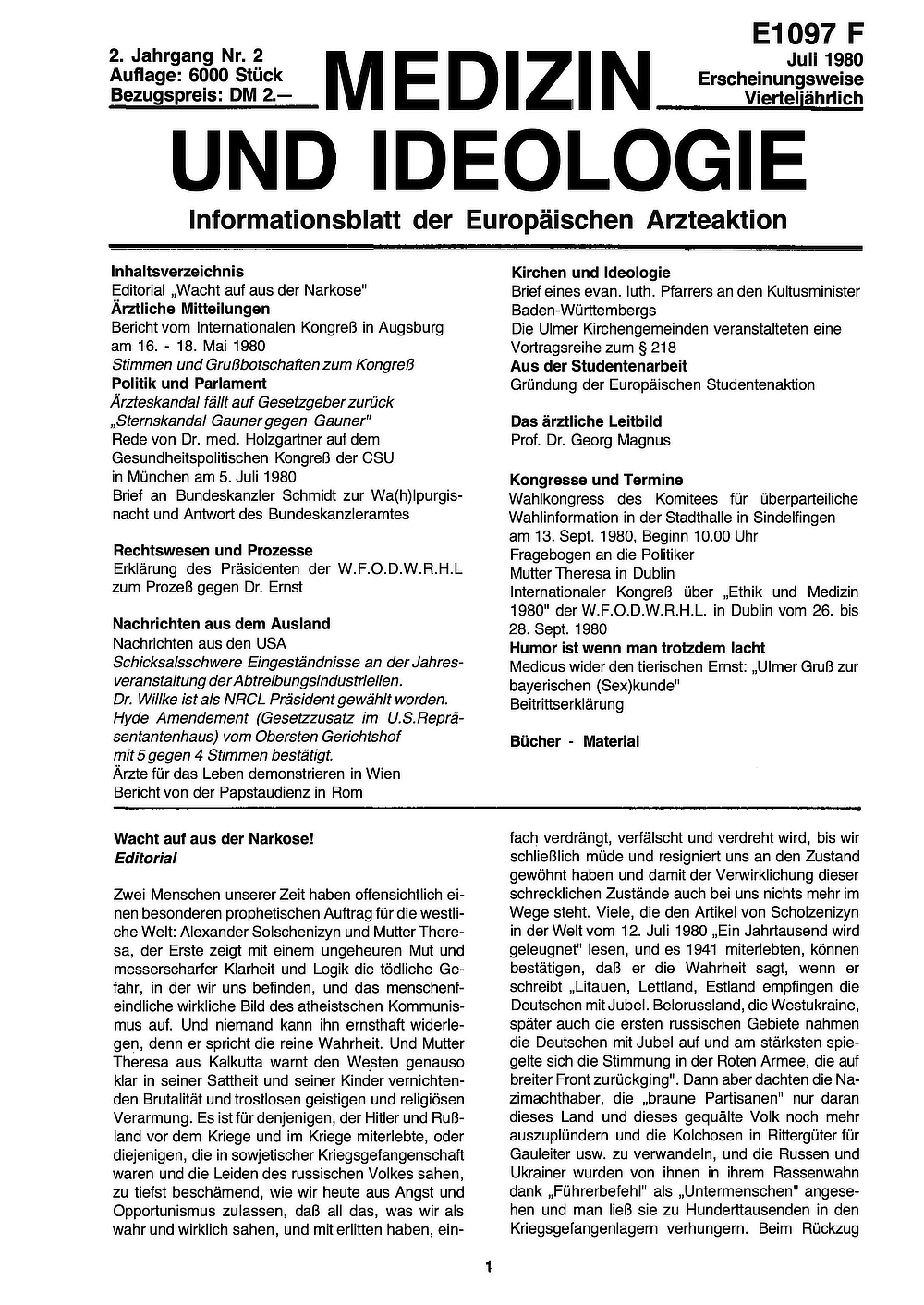Dabei gibt der Name Medizin und Ideologie immer mal wieder Anlaß zur Nachfrage, denn häufig versteht man unter „Ideologie" eine eher willkürliche, sachlich nur teilweise begründete und verzerrte Wahrnehmung und Interpretation der Realität. Doch der Begriff „Ideologie" bedeutet wörtlich die „Lehre von den Ideen" und die Ausformung einer konkreten weltanschaulichen Perspektive im Sinne eines schlüssigen Ideensystems. Und so dient diese Zeitschrift dem Anliegen, die medizinisch-ethischen Grenzfragen im Kontext der sie beeinflussenden weltanschaulichen Ideen darzustellen und zu verstehen.
