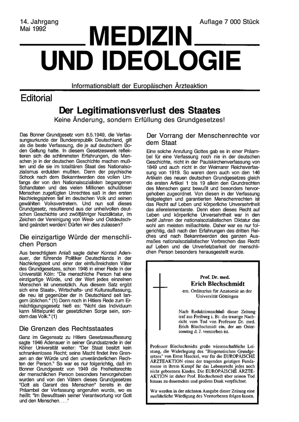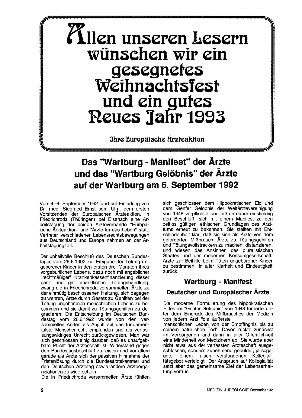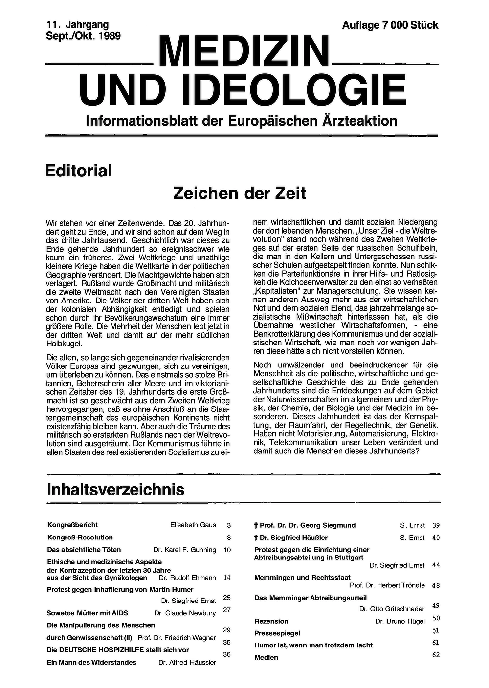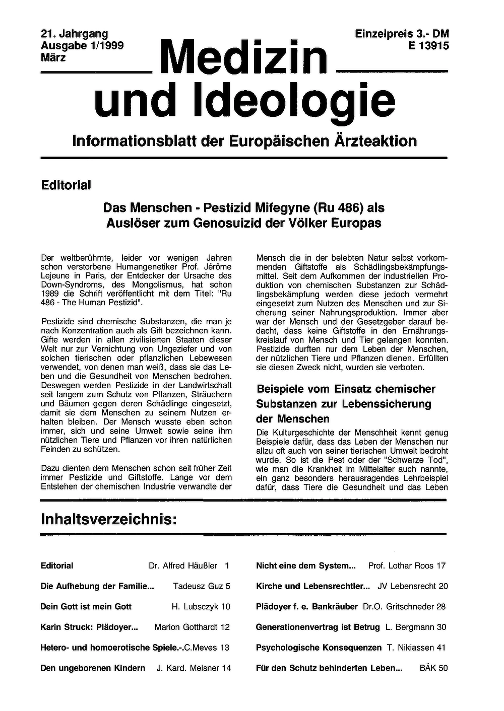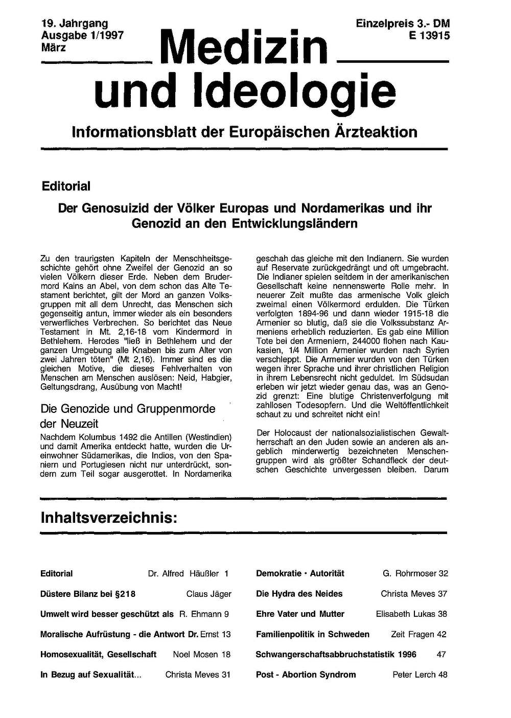 Dabei gibt der Name Medizin und Ideologie immer mal wieder Anlaß zur Nachfrage, denn häufig versteht man unter „Ideologie" eine eher willkürliche, sachlich nur teilweise begründete und verzerrte Wahrnehmung und Interpretation der Realität. Doch der Begriff „Ideologie" bedeutet wörtlich die „Lehre von den Ideen" und die Ausformung einer konkreten weltanschaulichen Perspektive im Sinne eines schlüssigen Ideensystems. Und so dient diese Zeitschrift dem Anliegen, die medizinisch-ethischen Grenzfragen im Kontext der sie beeinflussenden weltanschaulichen Ideen darzustellen und zu verstehen.