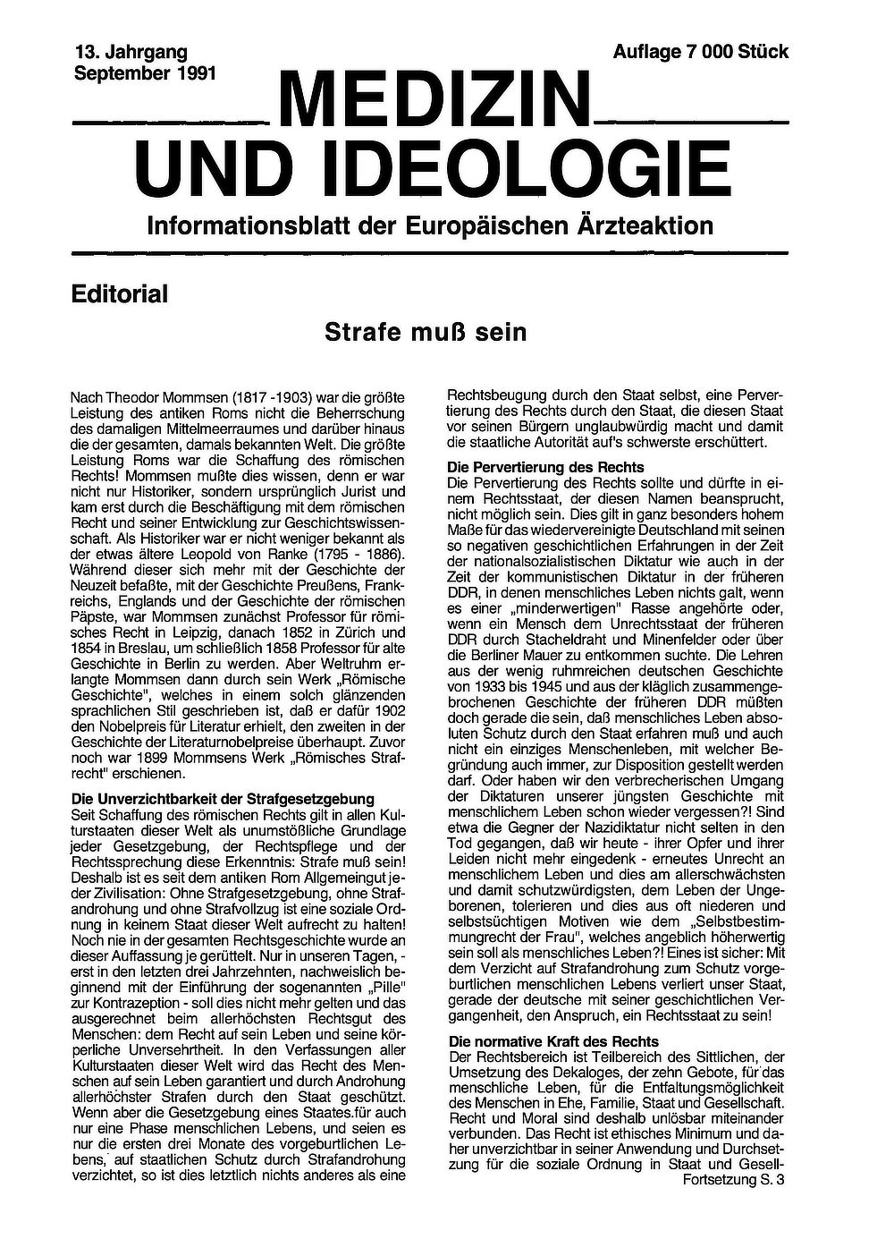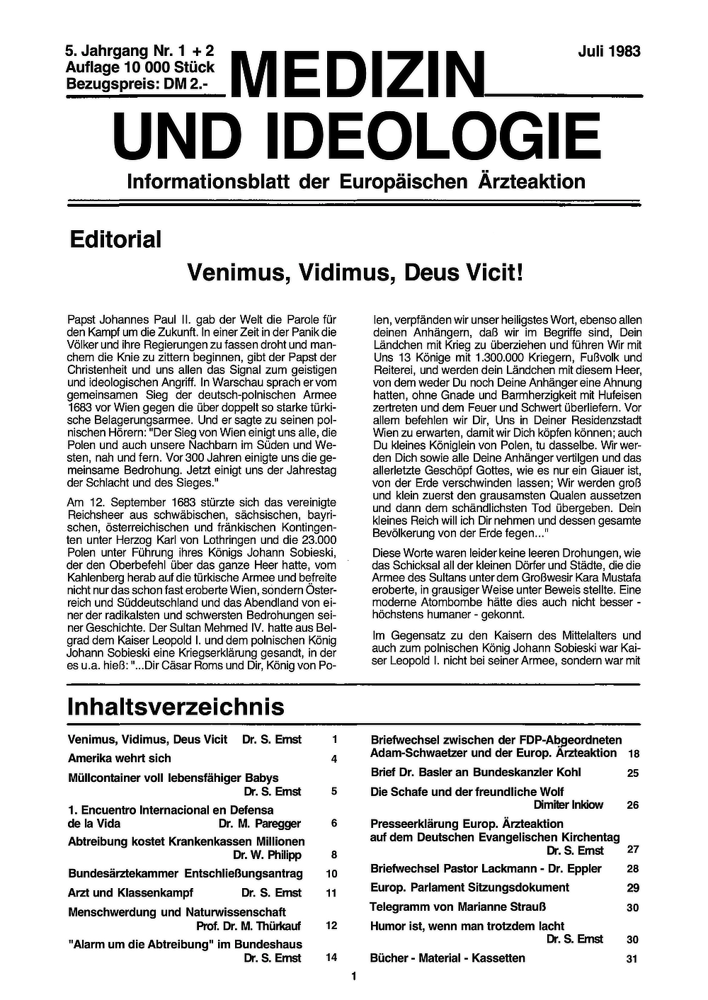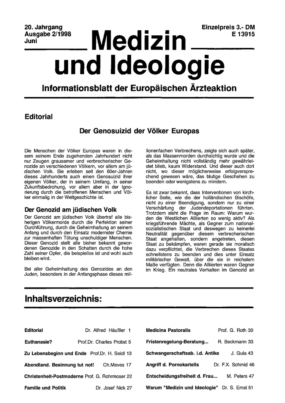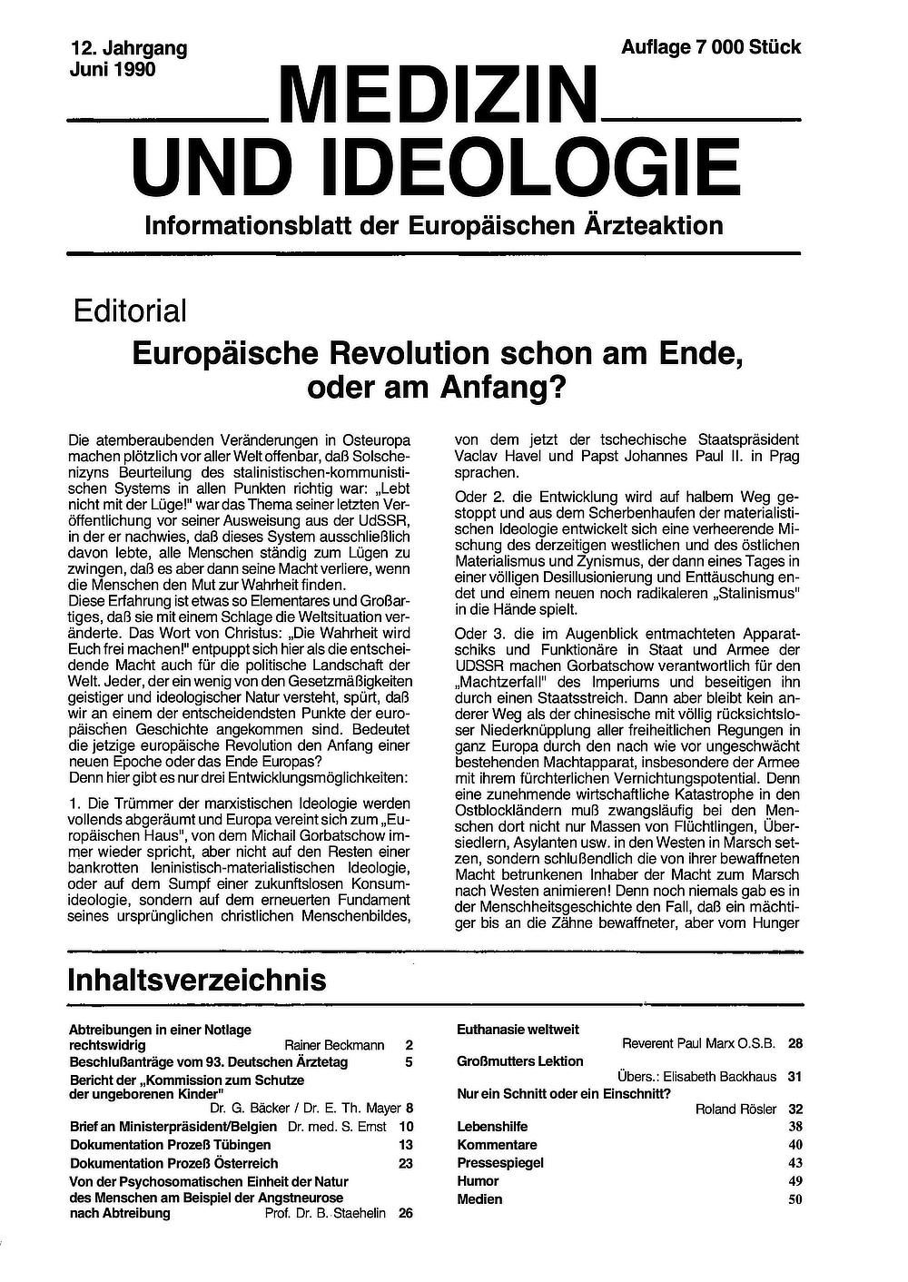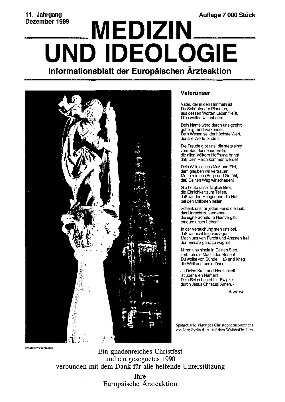 Dabei gibt der Name Medizin und Ideologie immer mal wieder Anlaß zur Nachfrage, denn häufig versteht man unter „Ideologie" eine eher willkürliche, sachlich nur teilweise begründete und verzerrte Wahrnehmung und Interpretation der Realität. Doch der Begriff „Ideologie" bedeutet wörtlich die „Lehre von den Ideen" und die Ausformung einer konkreten weltanschaulichen Perspektive im Sinne eines schlüssigen Ideensystems. Und so dient diese Zeitschrift dem Anliegen, die medizinisch-ethischen Grenzfragen im Kontext der sie beeinflussenden weltanschaulichen Ideen darzustellen und zu verstehen.